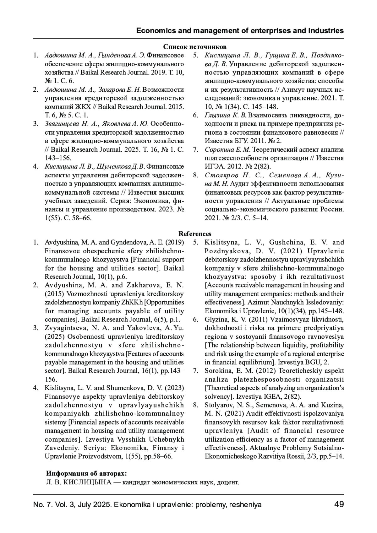 3. Звягинцева Н. А., Яковлева А. Ю. Особенности управления редиторской задолженностью в сфере жилищно-коммунального хозяйства// Baikal Research Journal. 2025. Т. 16, № 1. С.143-156. EDN: QZLIPH