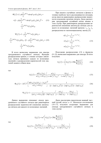 Проанализирован трехуровневый случайный сигнал. Вычислены выражения, описывающие спектр данного сигнала. Полученные результаты могут использоваться для изучения физических объектов и технических систем, в которых протекают физические процессы, имеющие вид трехуровневого случайного сигнала. Процессы такого вида встречаются в различных областях физики. Отдельно отметим, что достаточно часто они встречаются при исследовании флуктуационных явлений. Например, в следующих значительных для теории флуктуаций случаях. Одним из наиболее важных типов электрических шумов в твердых телах и электронных приборах является взрывной шум [6]. Как установлено в [6, 7], взрывной шум может представлять собой не только бистабильный сигнал ступенчатой формы. Иногда наблюдается многоступенчатый шум, когда существует три или более возможных значений сигнала [7–9]. Шум – стохастический процесс. Соответственно взрывной шум с тремя возможными значениями сигнала представляет собой трехуровневый случайный сигнал, и для изучения такого шума можно использовать результаты, полученные в данной статье. Другим примером являются электрические флуктуации в полупроводниках, вызванные захватом и эмиссией носителей заряда ловушками. Известно, что в полупроводниках могут существовать двухзарядные ловушки [10]. Вследствие захвата и эмиссии носителей двухзарядной ловушкой проводимость полупроводника случайно изменяется, и протекающий в нем ток может принимать одно из трех возможных значений в зависимости от того захвачен ли ловушкой один носитель, захвачено два носителя или ловушка пустая [11, 12]. В таком случае ток в полупроводнике представляет собой трехуровневый случайный сигнал. Таким образом, для изучения электрических флуктуаций в полупроводниках, вызванных двухзарядными ловушками, могут быть использованы результаты данной статьи. Вообще, полученные в статье результаты могут иметь достаточно широкое применение, поскольку физические процессы, имеющие вид трехуровневого случайного сигнала, наблюдаются в различных областях физики. С сигналами такого вида встречаются при разработке различных технических устройств. Соответственно, полученные в статье результаты могут использоваться при решении многочисленных фундаментальных и прикладных задач.
