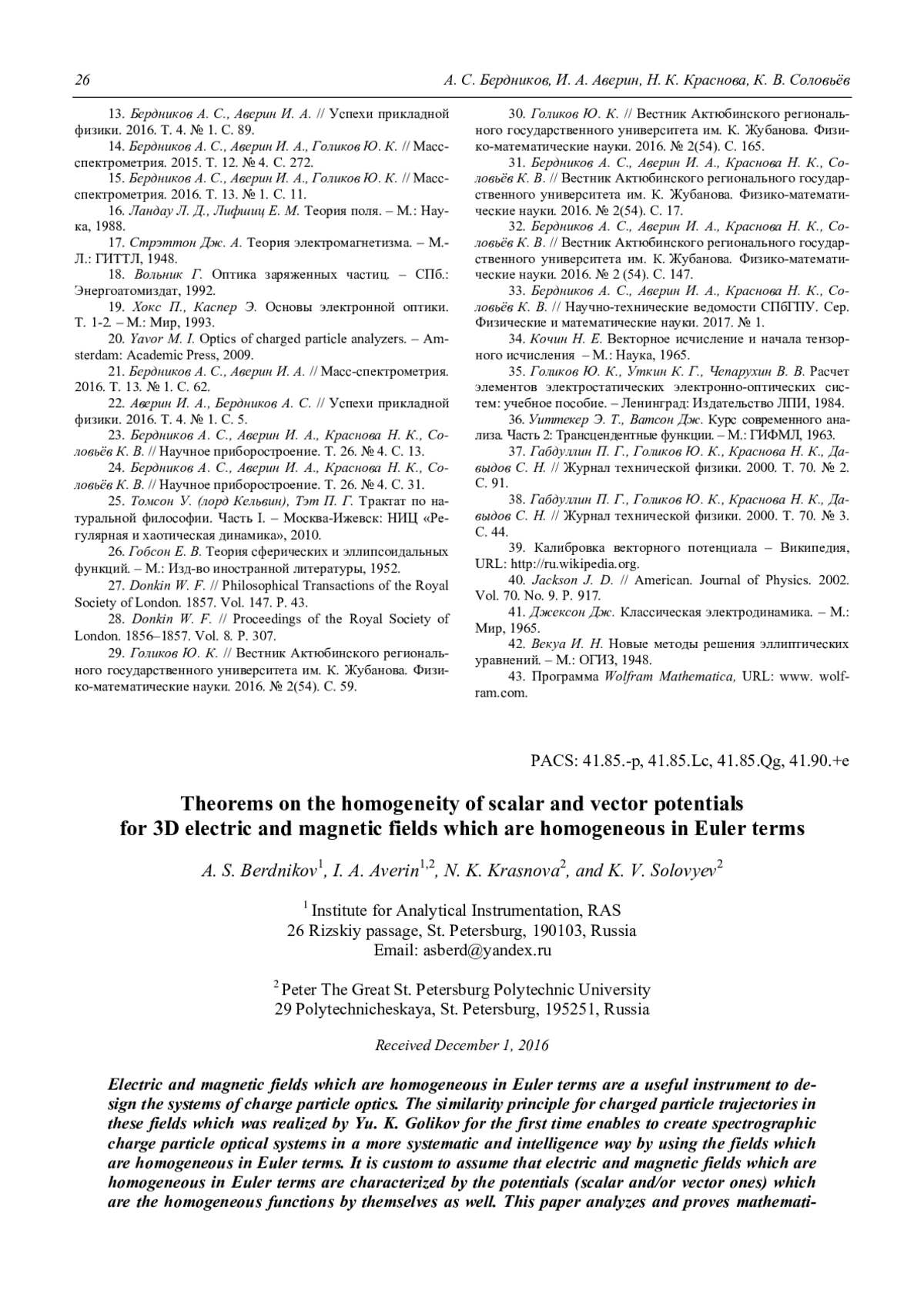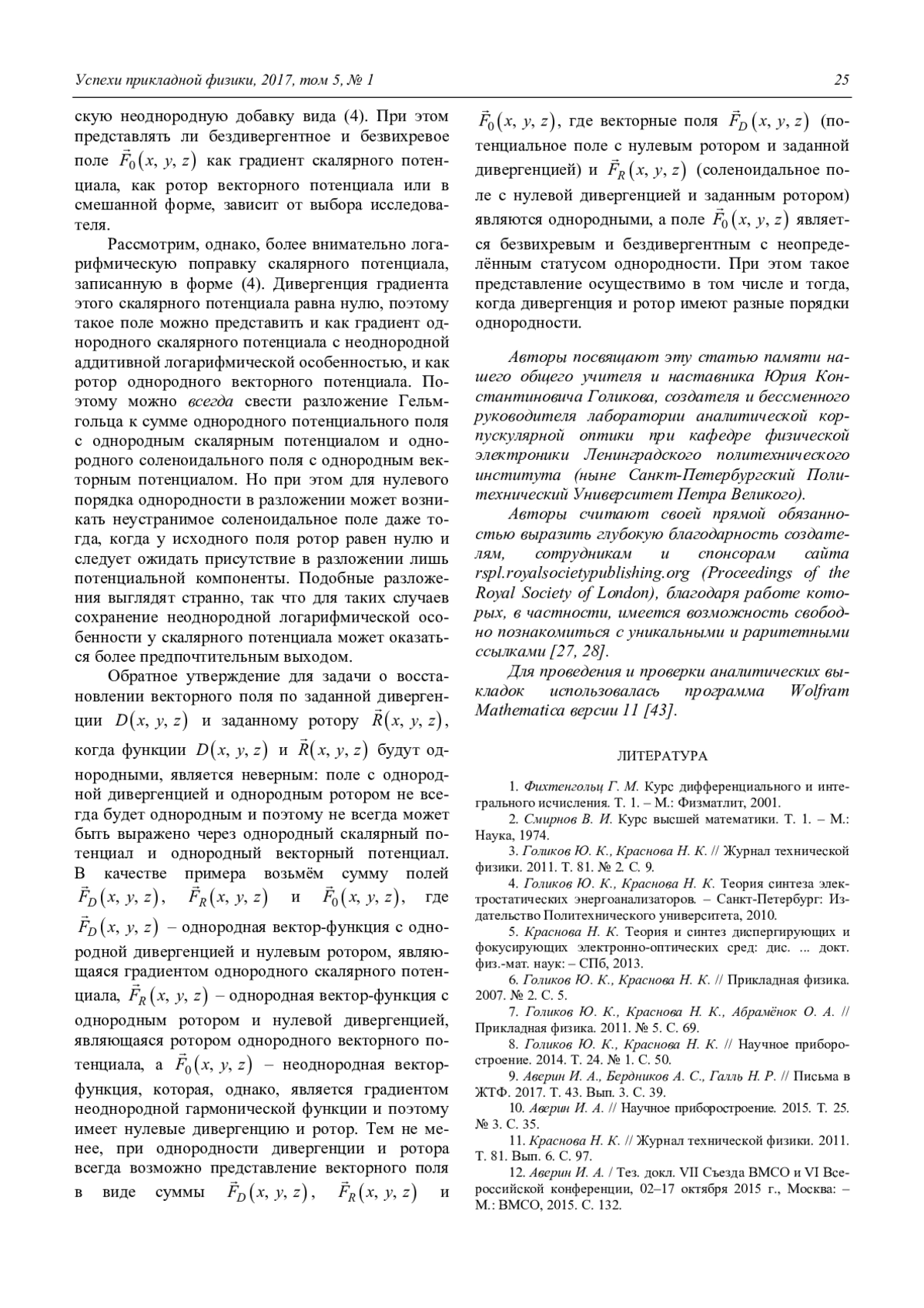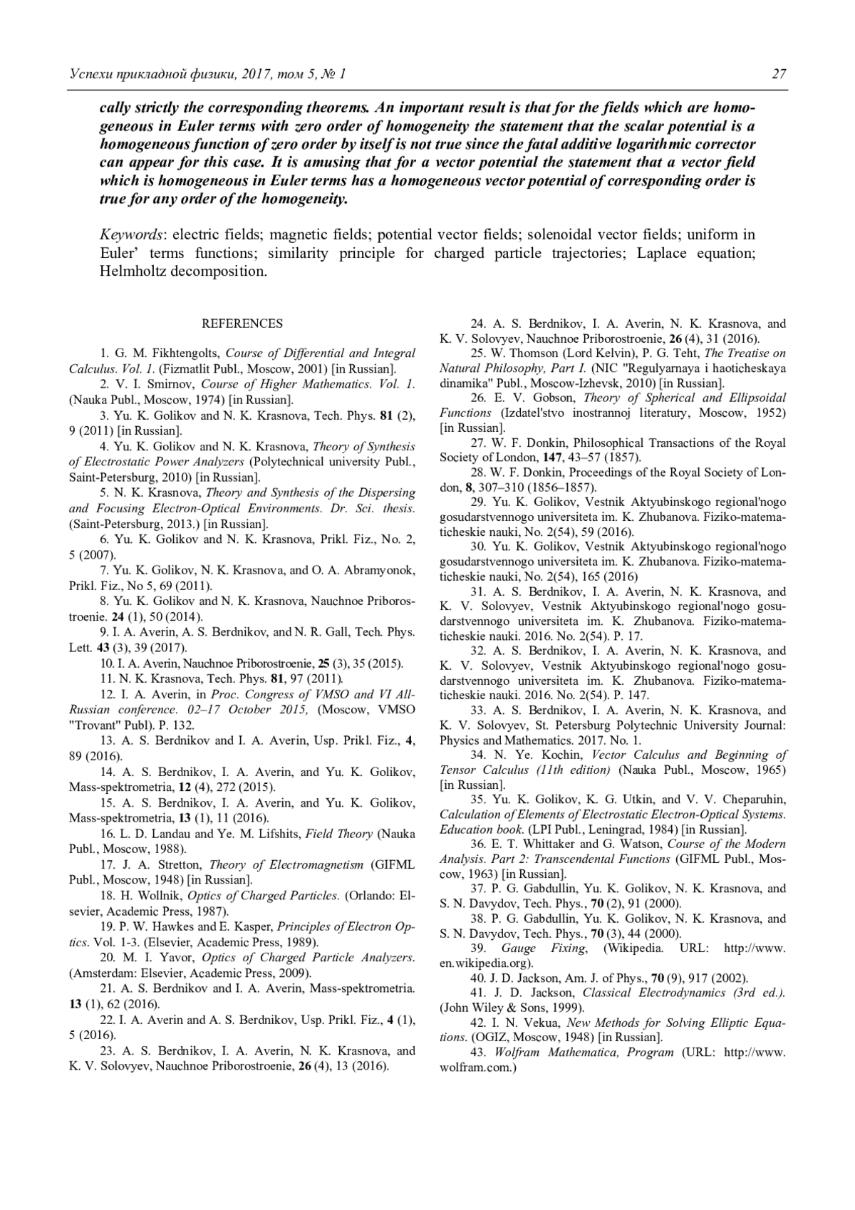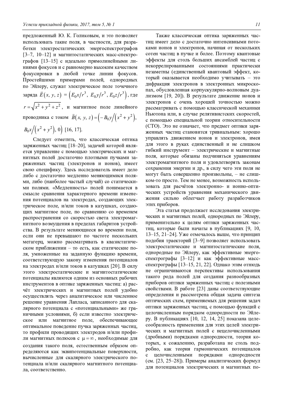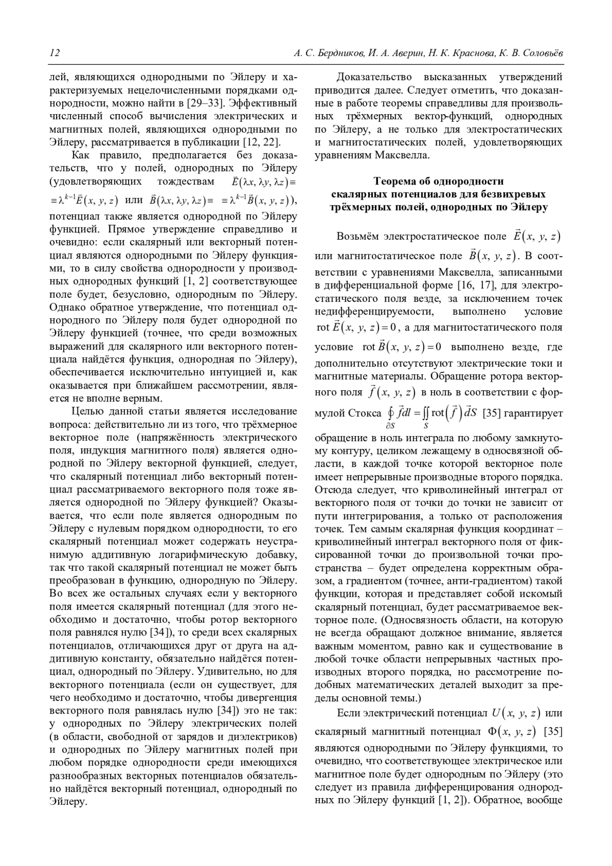 Электрические и магнитные поля, однородные по Эйлеру, являются удобным инструментом для разработки электронно- и ионно-оптических систем. Принцип подобия траекторий, впервые применённый Ю. К. Голиковым, позволяет с помощью полей, принадлежащих этому классу, целенаправленно синтезировать корпускулярно-оптические системы с идеальными спектрографическими свойствами. До сих пор предполагалось само собой разумеющимся, что однородные по Эйлеру электрические и магнитные поля описываются потенциалами, представляющими собой однородные по Эйлеру функции. В данной работе этот вопрос исследуется математически строго. Важным результатом является то, что для полей, однородных по Эйлеру с нулевым показателем однородности, утверждение об обязательной однородности скалярного потенциала не является справедливым (возможно присутствие аддитивной логарифмической добавки, не являющейся однородной функцией), но это является единственным исключением из рассмотренного правила. Однако для векторного потенциала утверждение о существовании у однородного по Эйлеру поля однородного же векторного потенциала, обладающего соответствующим порядком однородности, будет справедливым при всех порядках однородности, включая нулевой.