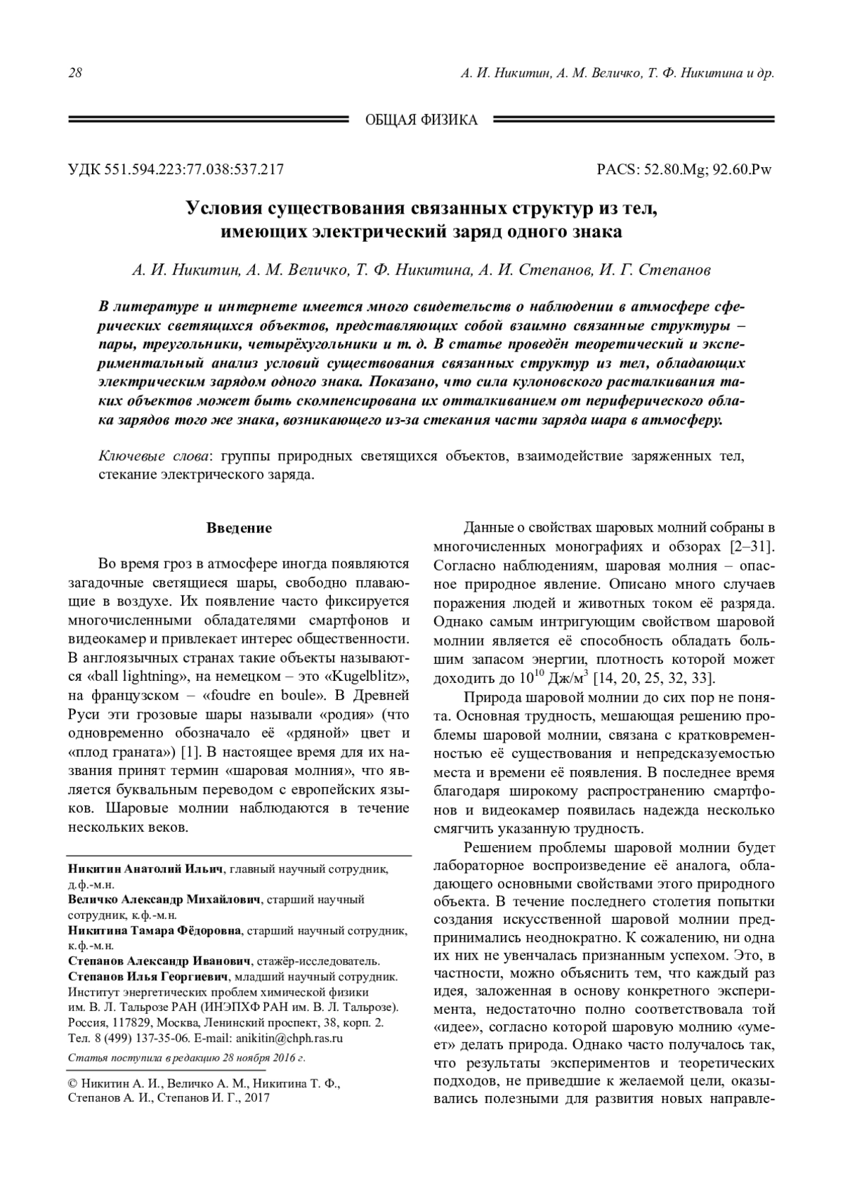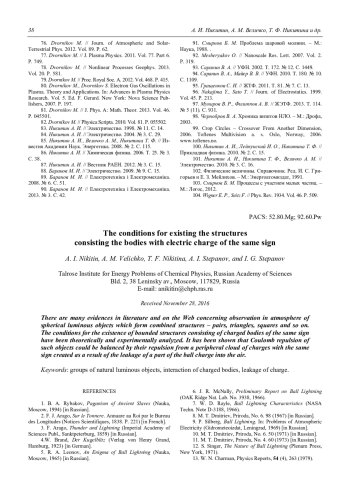 Никитин А. И., Величко А. М., Никитина Т. Ф., Степанов А. И., Степанов И. Г. Условия существования связанных структур из тел, имеющих электрический заряд одного знака 28