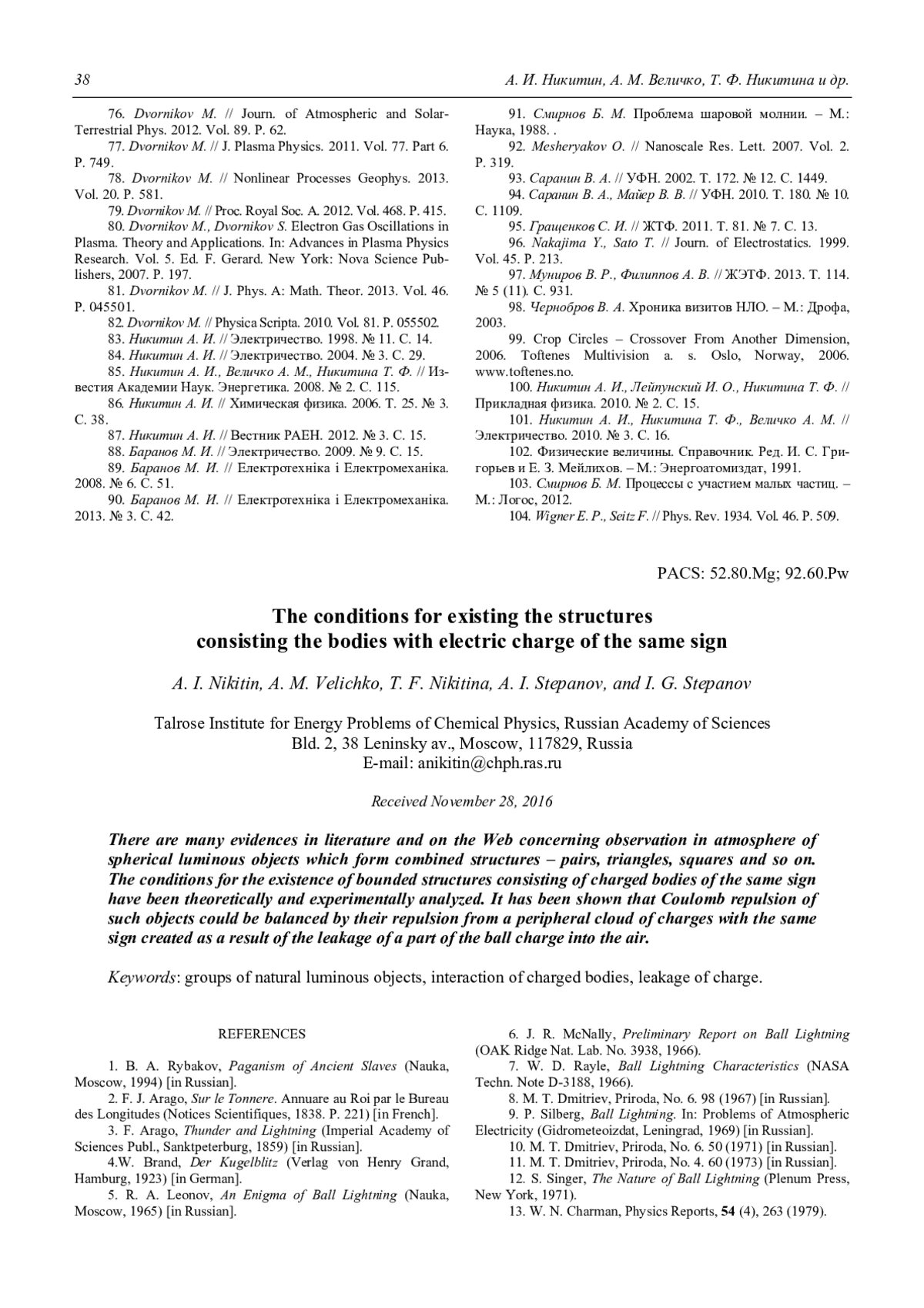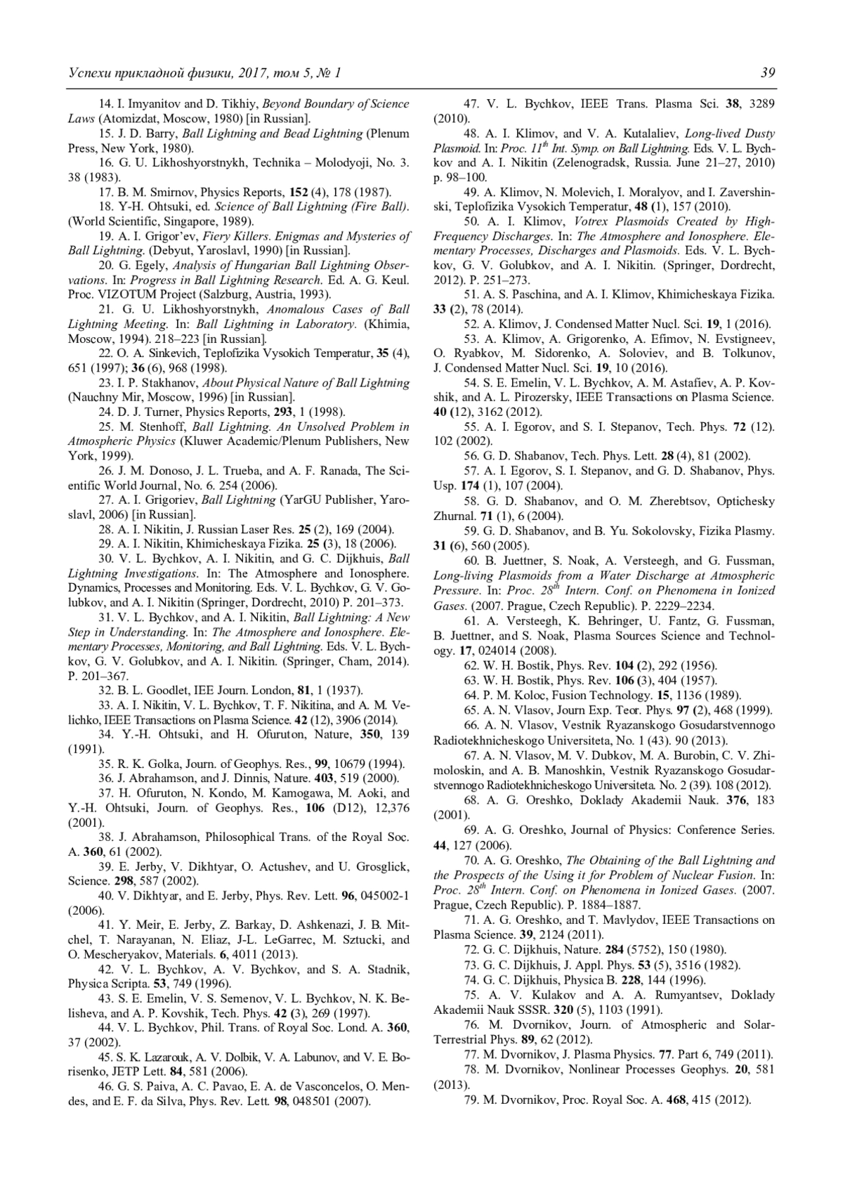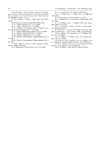 31. Bychkov V. L., Nikitin A. I. Ball Lightning: A New step in Understanding. In: The Atmosphere and Ionosphere. Elementary Processes, Monitoring, and Ball Lightning. Eds. V. L. Bychkov, G. V. Golubkov, A. I. Nikitin. Cham: Springer, 2014. P. 201–367.