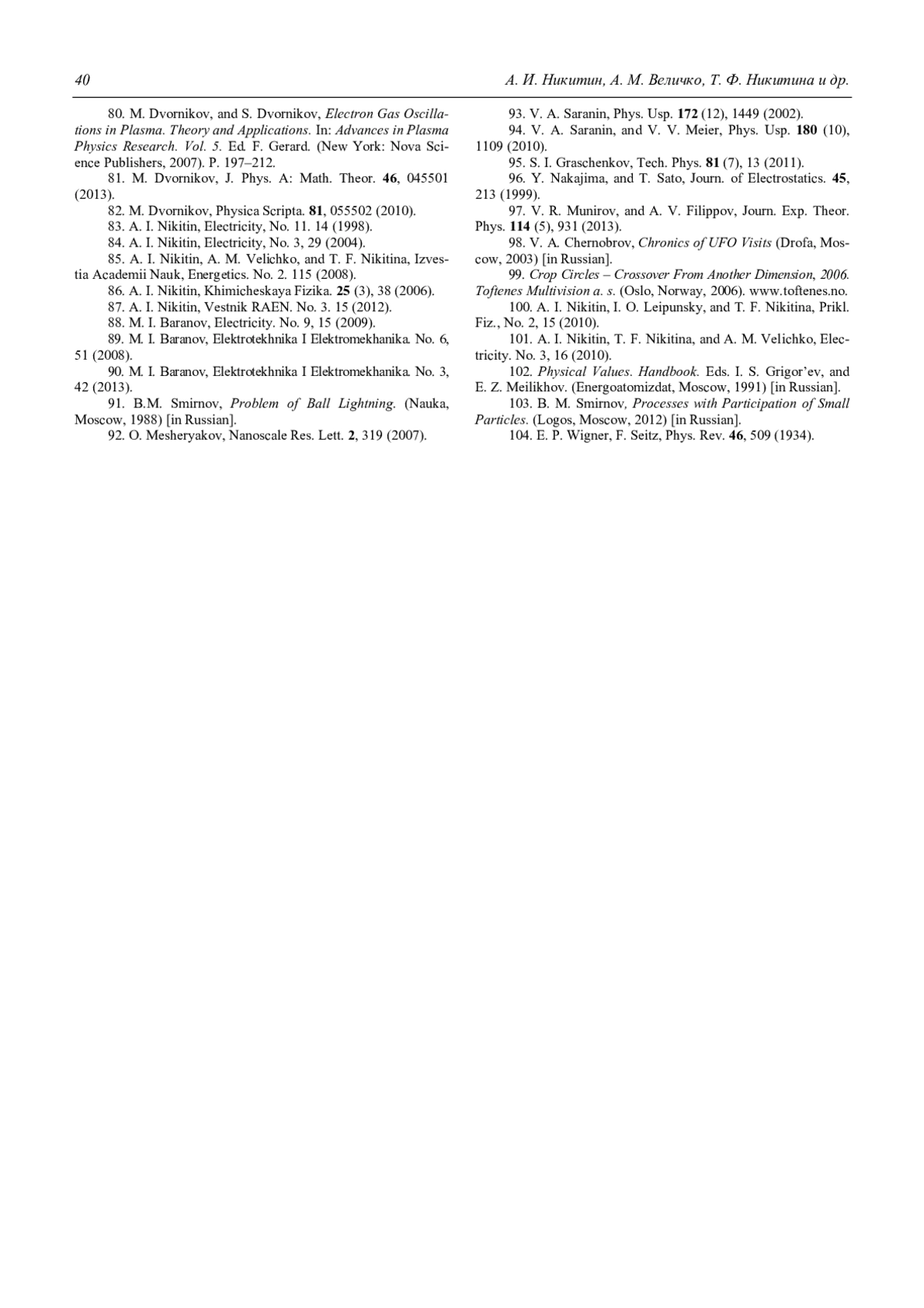 80. Dvornikov M., Dvornikov S. Electron Gas Oscillations in Plasma. Theory and Applications. In: Advances in Plasma Physics Research. Vol. 5. Ed. F. Gerard. New York: Nova Science Publishers, 2007. P. 197.