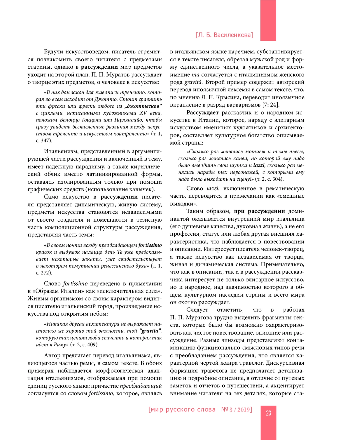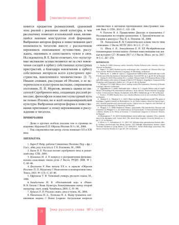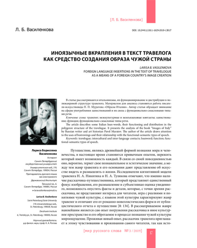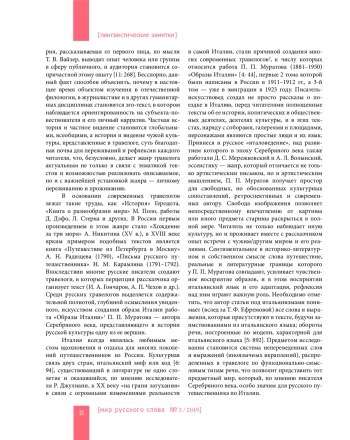 В статье рассматриваются итальянизмы, их функционирование и дистрибуция в полижанровой структуре травелога. Материалом для анализа становится работа писателя-искусствоведа П. П. Муратова «Образы Италии». Автор статьи обращает внимание на сферы употребления заимствований и их связь с функционально-смысловыми типами речи