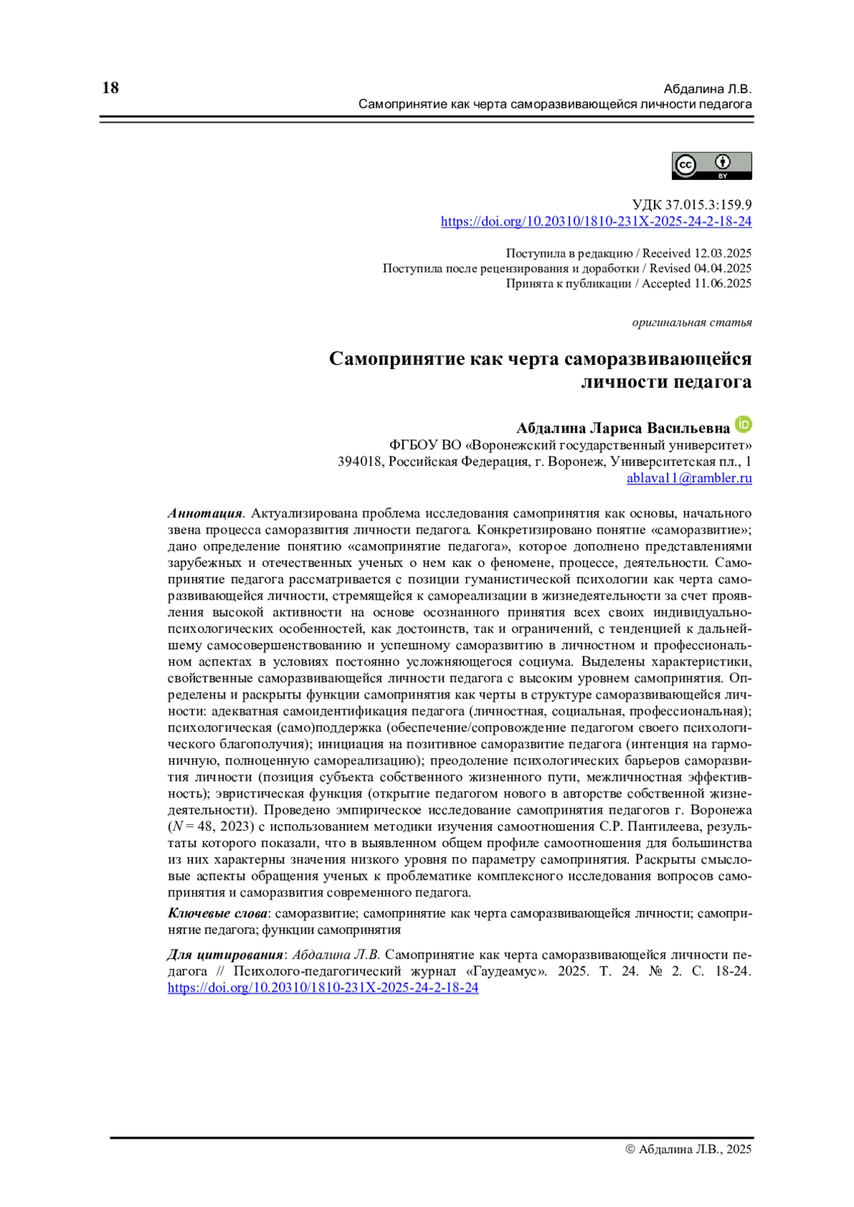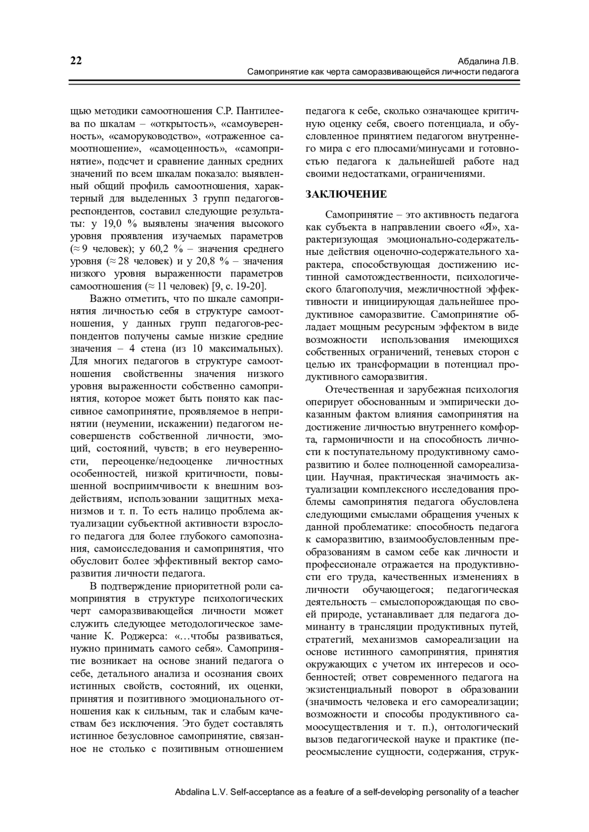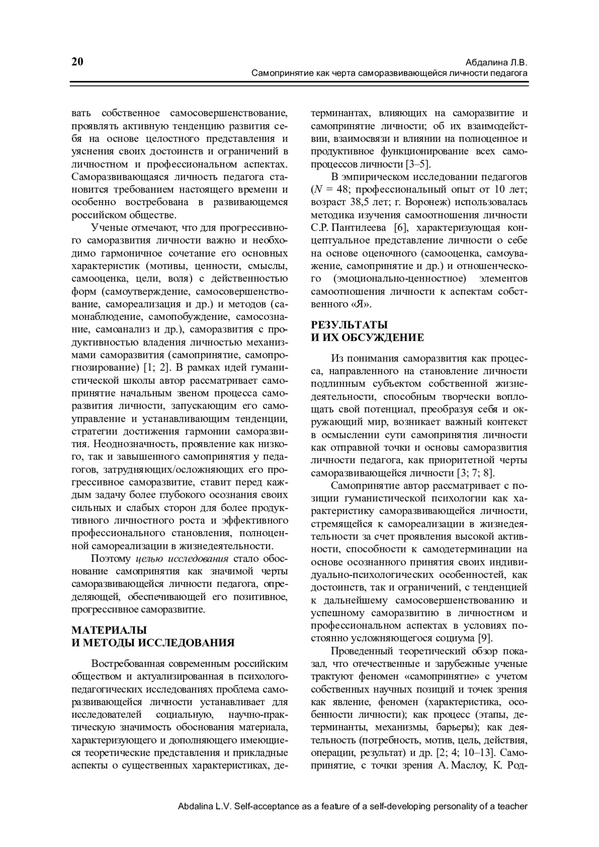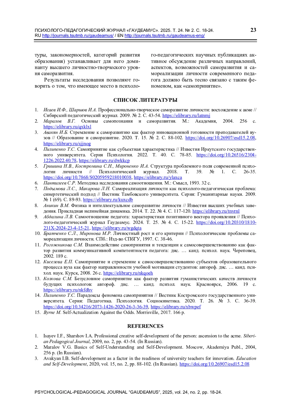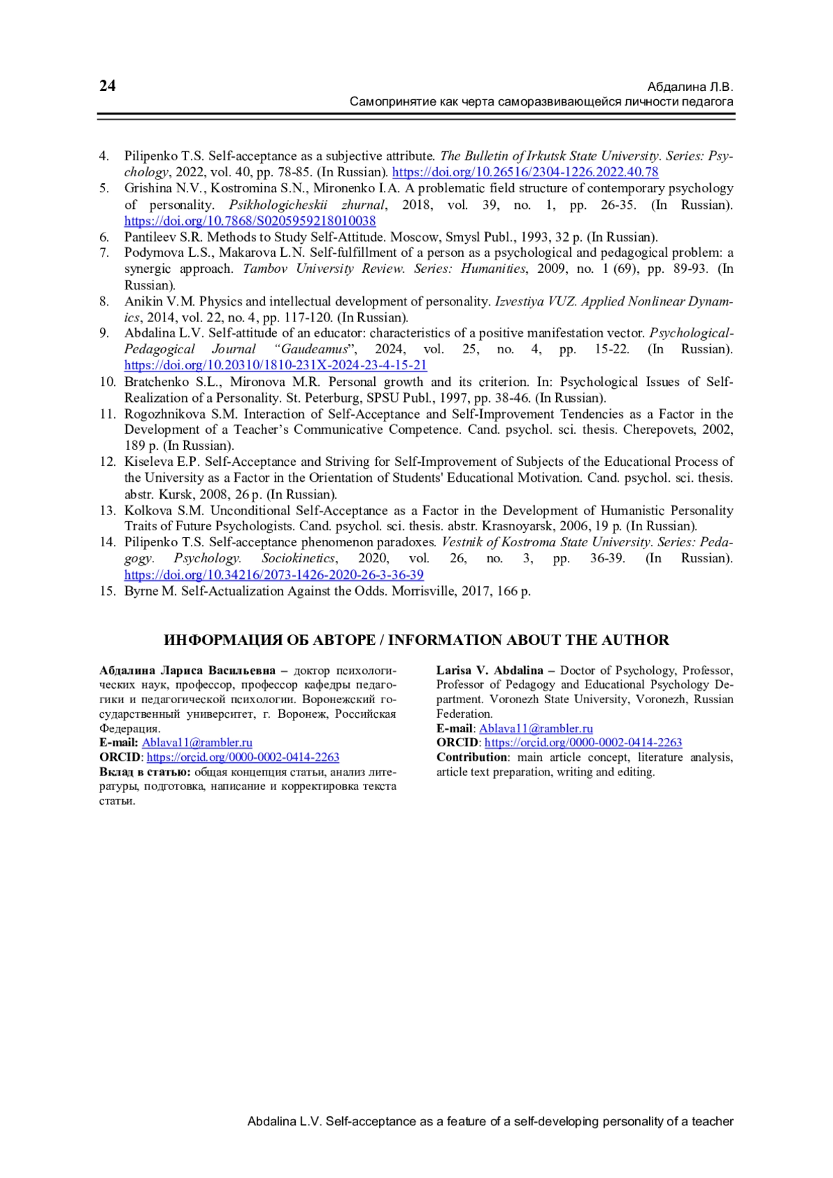 9. Абдалина Л.В. Самоотношение педагога: характеристики позитивного вектора проявления // Психолого-педагогический журнал Гаудеамус. 2024. Т. 25. № 4. С. 15-22. ,. DOI: 10.20310/1810-231X-2024-23-4-15-21