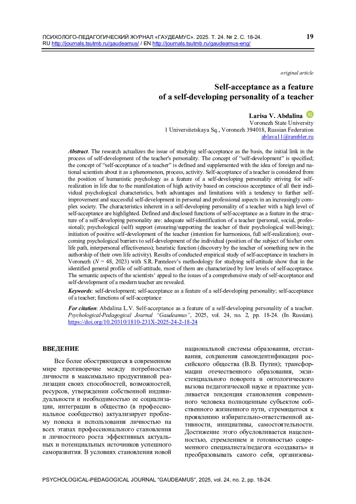 Актуализирована проблема исследования самопринятия как основы, начального звена процесса саморазвития личности педагога. Конкретизировано понятие «саморазвитие»; дано определение понятию «самопринятие педагога», которое дополнено представлениями зарубежных и отечественных ученых о нем как о феномене, процессе, деятельности. Самопринятие педагога рассматривается с позиции гуманистической психологии как черта саморазвивающейся личности, стремящейся к самореализации в жизнедеятельности за счет проявления высокой активности на основе осознанного принятия всех своих индивидуальнопсихологических особенностей, как достоинств, так и ограничений, с тенденцией к дальнейшему самосовершенствованию и успешному саморазвитию в личностном и профессиональном аспектах в условиях постоянно усложняющегося социума. Выделены характеристики, свойственные саморазвивающейся личности педагога с высоким уровнем самопринятия. Определены и раскрыты функции самопринятия как черты в структуре саморазвивающейся личности: адекватная самоидентификация педагога (личностная, социальная, профессиональная); психологическая (само)поддержка (обеспечение/сопровождение педагогом своего психологического благополучия); инициация на позитивное саморазвитие педагога (интенция на гармоничную, полноценную самореализацию); преодоление психологических барьеров саморазвития личности (позиция субъекта собственного жизненного пути, межличностная эффективность); эвристическая функция (открытие педагогом нового в авторстве собственной жизнедеятельности). Проведено эмпирическое исследование самопринятия педагогов г. Воронежа (N = 48, 2023) с использованием методики изучения самоотношения С. Р. Пантилеева, результаты которого показали, что в выявленном общем профиле самоотношения для большинства из них характерны значения низкого уровня по параметру самопринятия. Раскрыты смысловые аспекты обращения ученых к проблематике комплексного исследования вопросов самопринятия и саморазвития современного педагога.