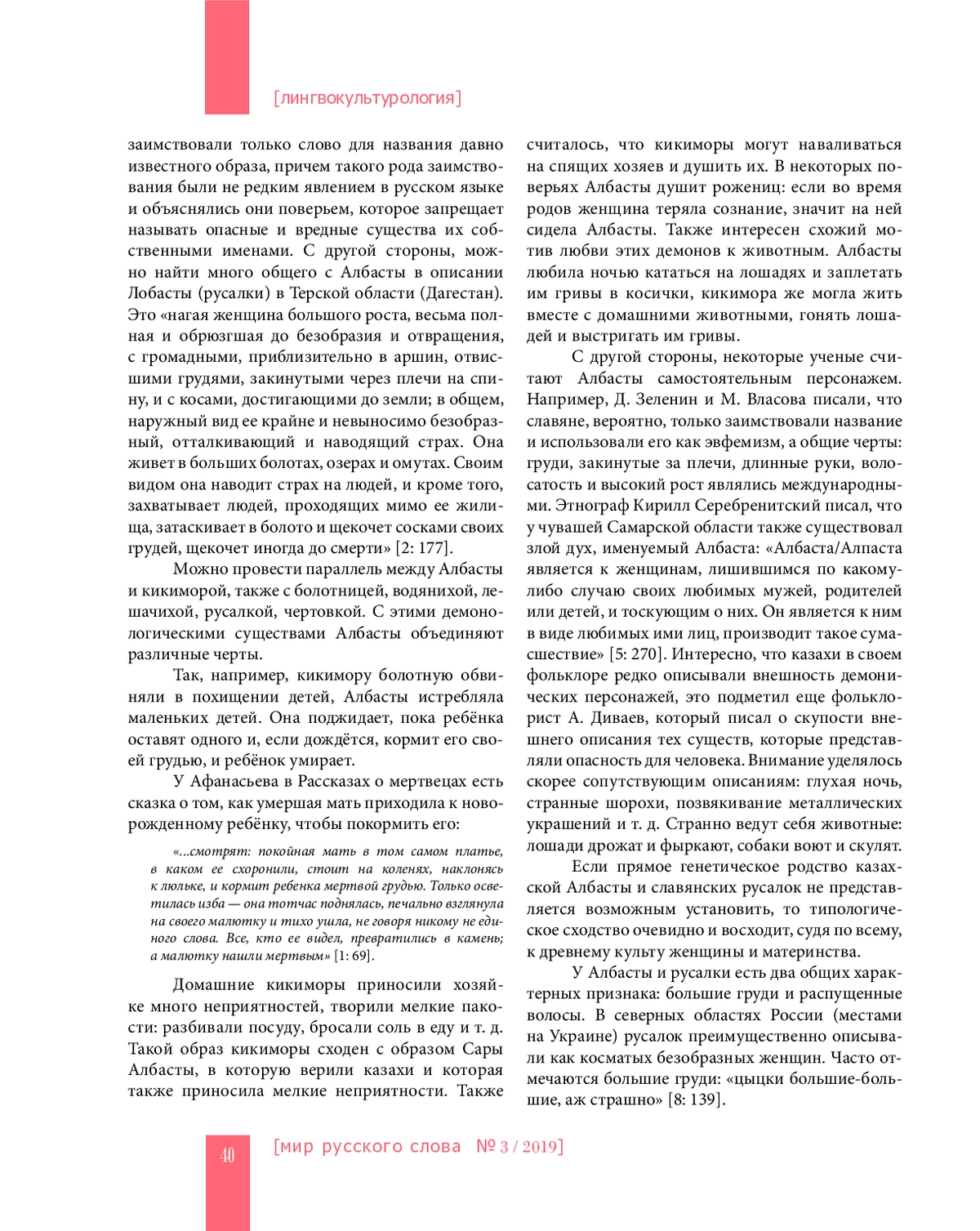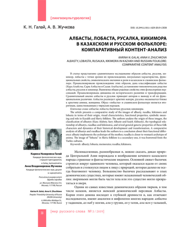 В статье представлено сравнительное исследование образов албасты, русалок, кикимор, лобасты с точки зрения их происхождения, визуальных характеристик, функциональных свойств, символического значения и роли в казахском и славянском фольклоре. Проанализировано происхождение этих образов, дана классификация албасты (Кара Алабсты, Сары Албасты и Сасык Алсбасты), установлено типологическое родство албасты, русалок и кикимор. Выявлены общие родовые свойства этих фольклорных персонажей. Проанализирована динамика их исторического развития и трансформации. Сравнительный анализ албасты и русалок приводит авторов к выводу и об их функциональном различии: Албасты реализует архетип матери, русалка оказывается ближе к архетипу анимы, женщины. Образ «лобасты» в славянском фольклоре является вторичным, заимствованным у тюркских народов