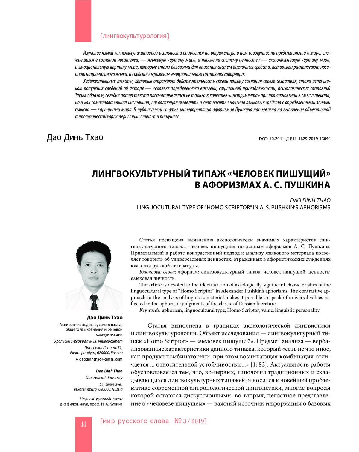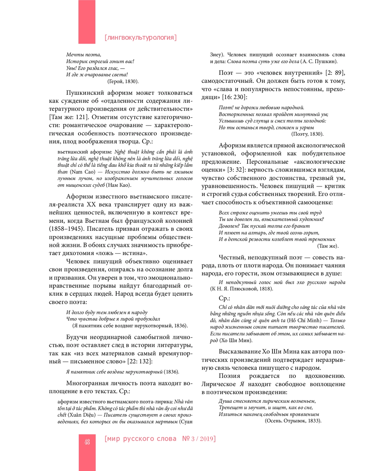 Статья посвящена выявлению аксиологически значимых характеристик лингвокультурного типажа «человек пишущий» по данным афоризмов А. С. Пушкина. Применяемый в работе контрастивный подход к анализу языкового материала позволяет говорить об универсальных ценностях, отраженных в афористических суждениях классика русской литературы