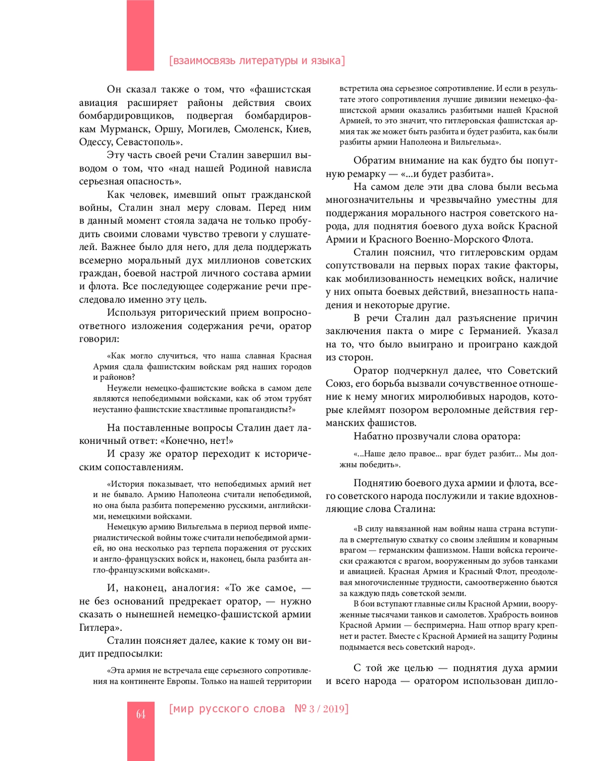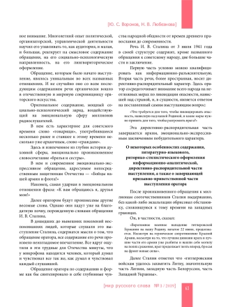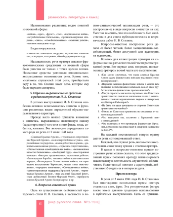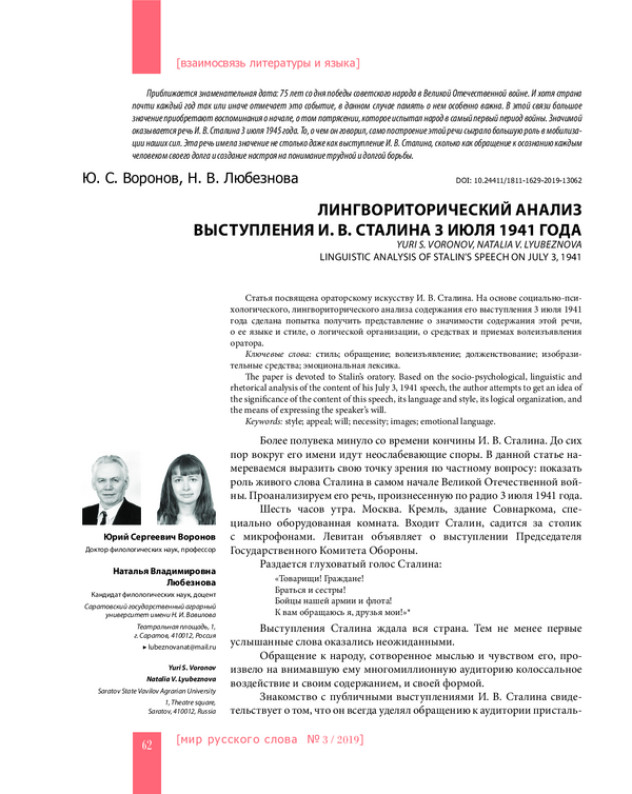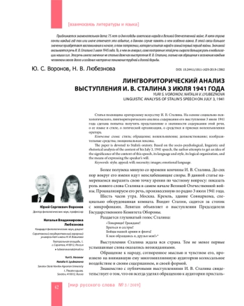 Статья посвящена ораторскому искусству И. В. Сталина. На основе социально-психологического, лингвориторического анализа содержания его выступления 3 июля 1941 года сделана попытка получить представление о значимости содержания этой речи, о ее языке и стиле, о логической организации, о средствах и приемах волеизъявления оратора