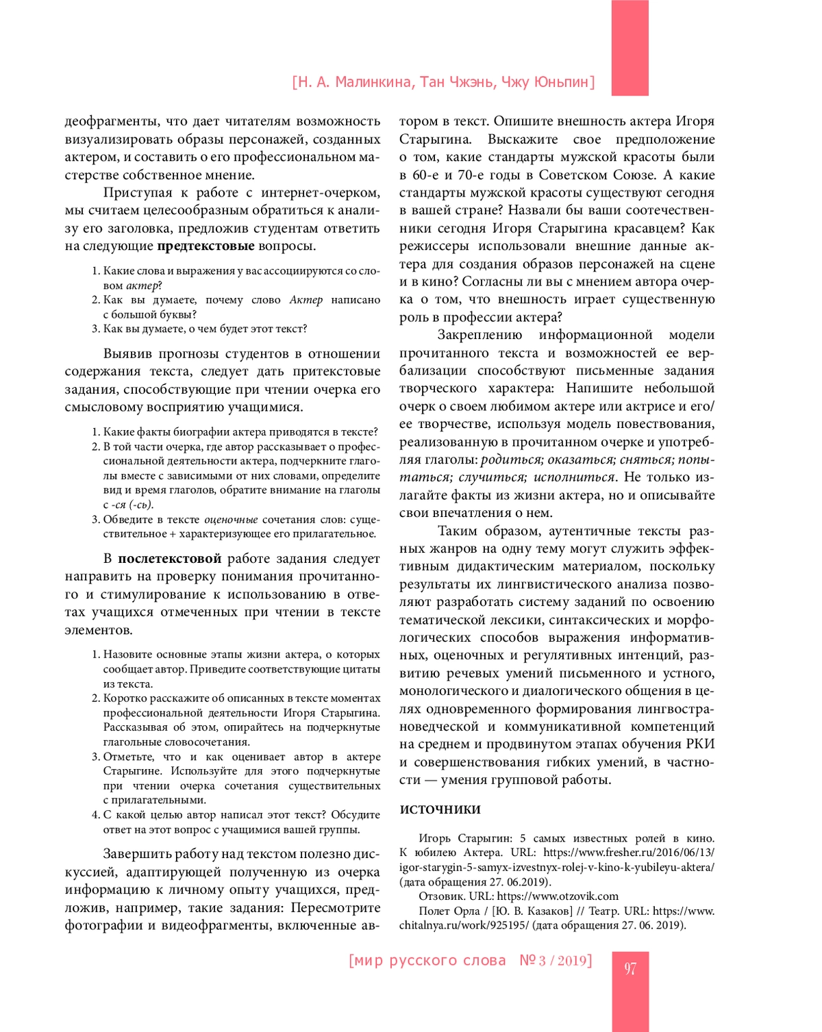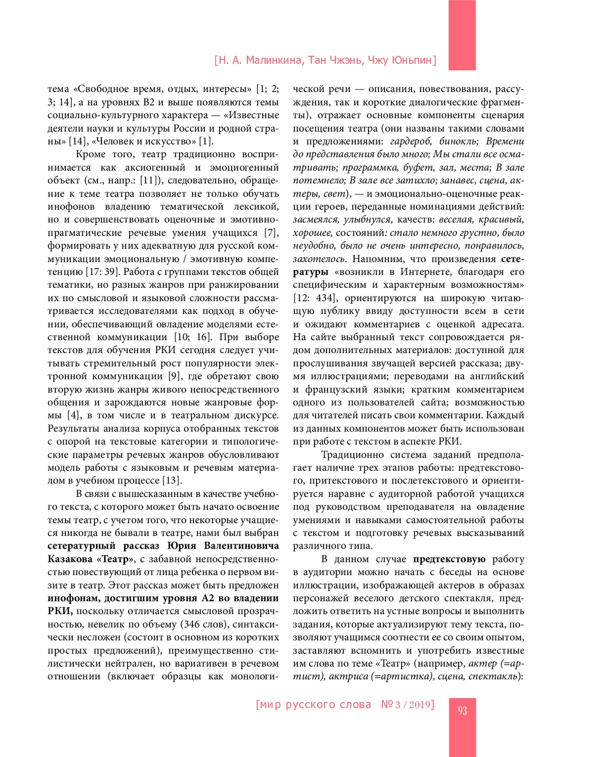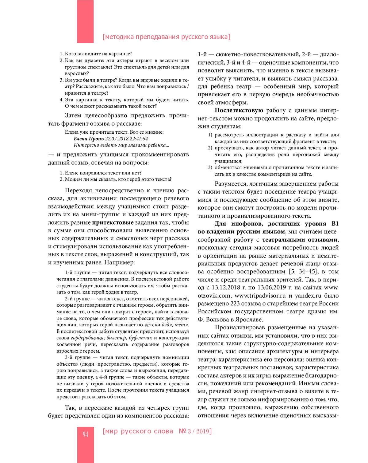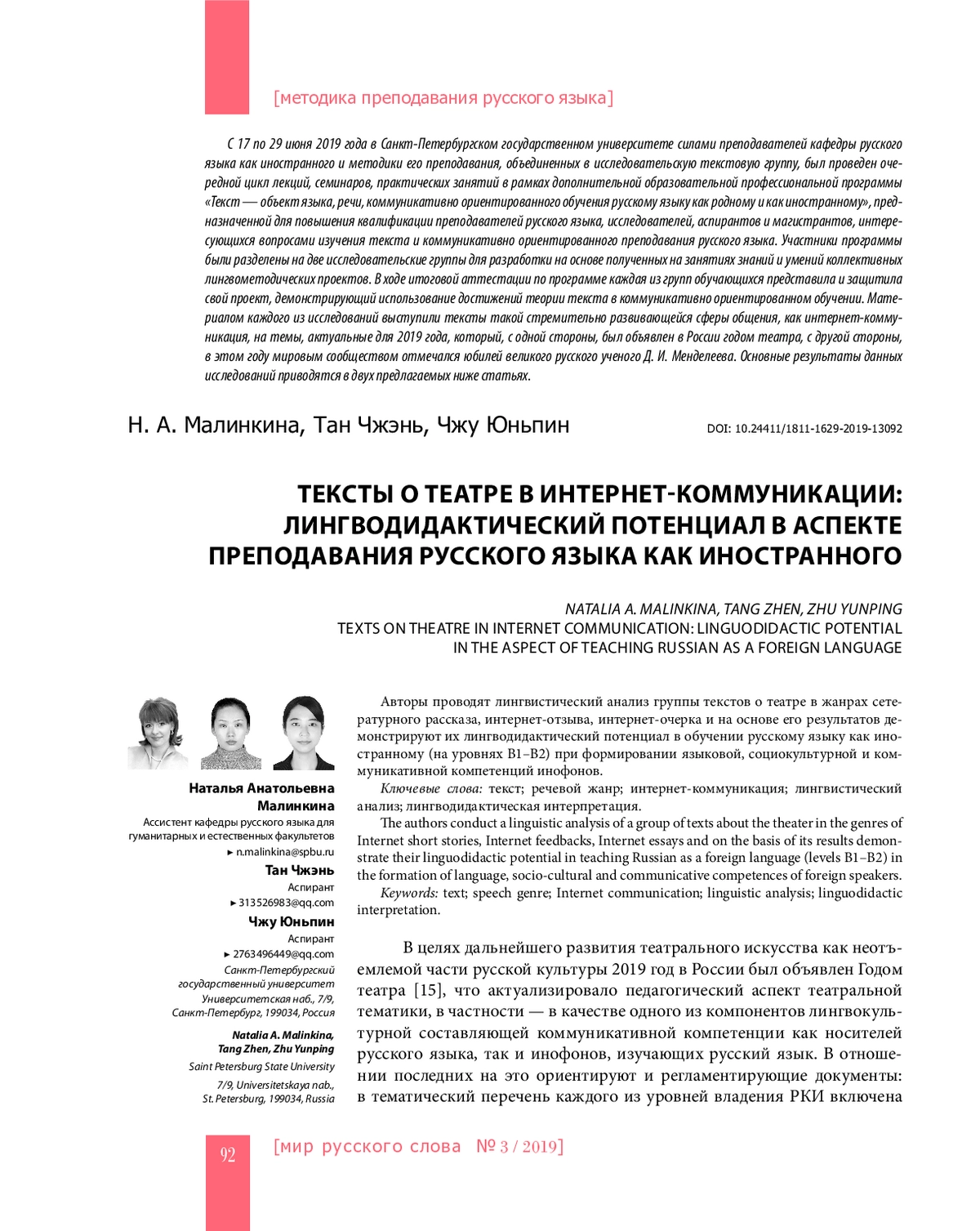 Авторы проводят лингвистический анализ группы текстов о театре в жанрах сетературного рассказа, интернет-отзыва, интернет-очерка и на основе его результатов демонстрируют их лингводидактический потенциал в обучении русскому языку как иностранному (на уровнях В1–В2) при формировании языковой, социокультурной и коммуникативной компетенций инофонов