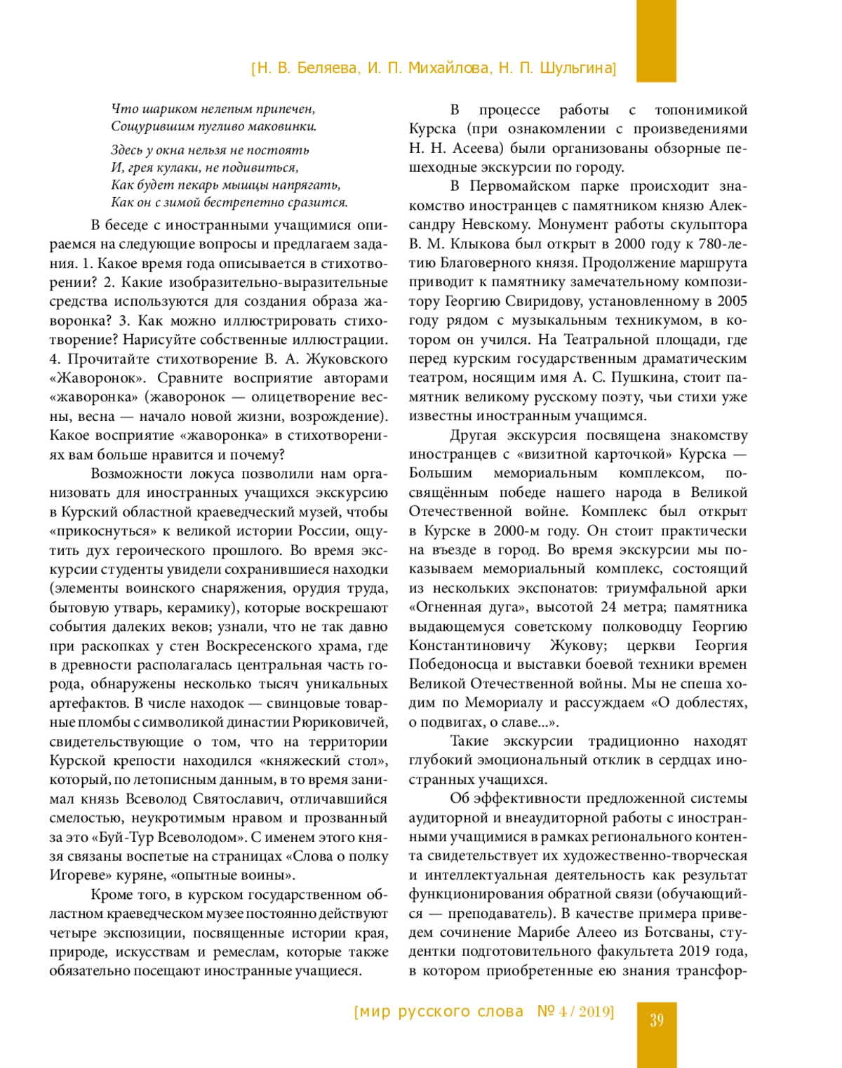 22. Шульгина Н. П., Беляева Н. В. Работа с художественным текстом на занятиях по русскому по русскому языку как иностранному // “Учитель для будущего: язык, культура, личность (к 200-летию со дня рождения Ф. И. Буслаева”): коллект. монография. М., 2018. С. 428-435. EDN: VLUEAQ