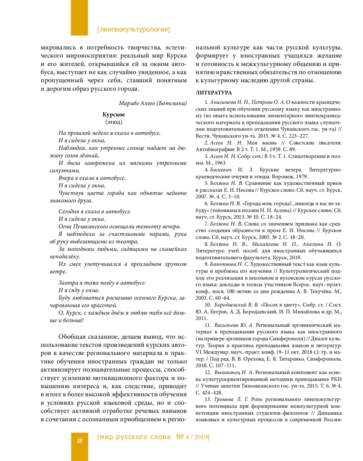 8. Беляева Н. В., Михайлова И. П., Амелина И. О. Литература: учеб. пособ. для иностранных обучающихся подготовительного факультета. Курск, 2019. EDN: HUGSTP