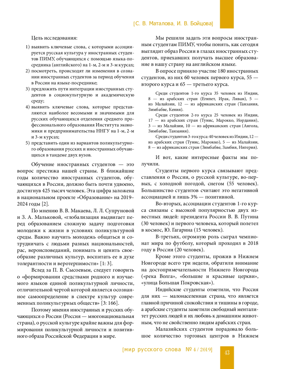 В статье описаны результаты исследования мнений о России и русской культуре иностранных студентов Приволжского исследовательского медицинского университета и русских обучающихся отделения среднего профессионального образования Института экономики и предпринимательства Национального исследовательского Нижегородского государственного университета имени Н. И. Лобачевского. Выявлены ключевые слова, с которыми ассоциируется образ России у русских и иностранных обучающихся на 1-м, 2-м и 3-м курсах. Предложены эффективные методы интеграции иностранных студентов в социокультурную и академическую среду. Представлен один из вариантов поликультурного образования русских и иностранных обучающихся в тандеме.