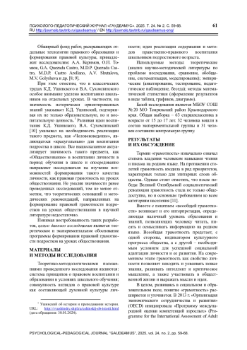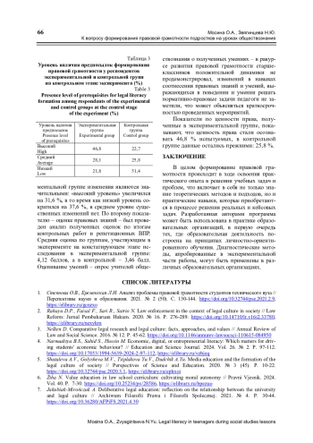 1. Степнова О.В., Еременская Л.И. Анализ проблемы правовой грамотности студентов технического вуза // Перспективы науки и образования. 2021. № 2 (50). С. 130-144. ,. DOI: 10.32744/pse.2021.2.9