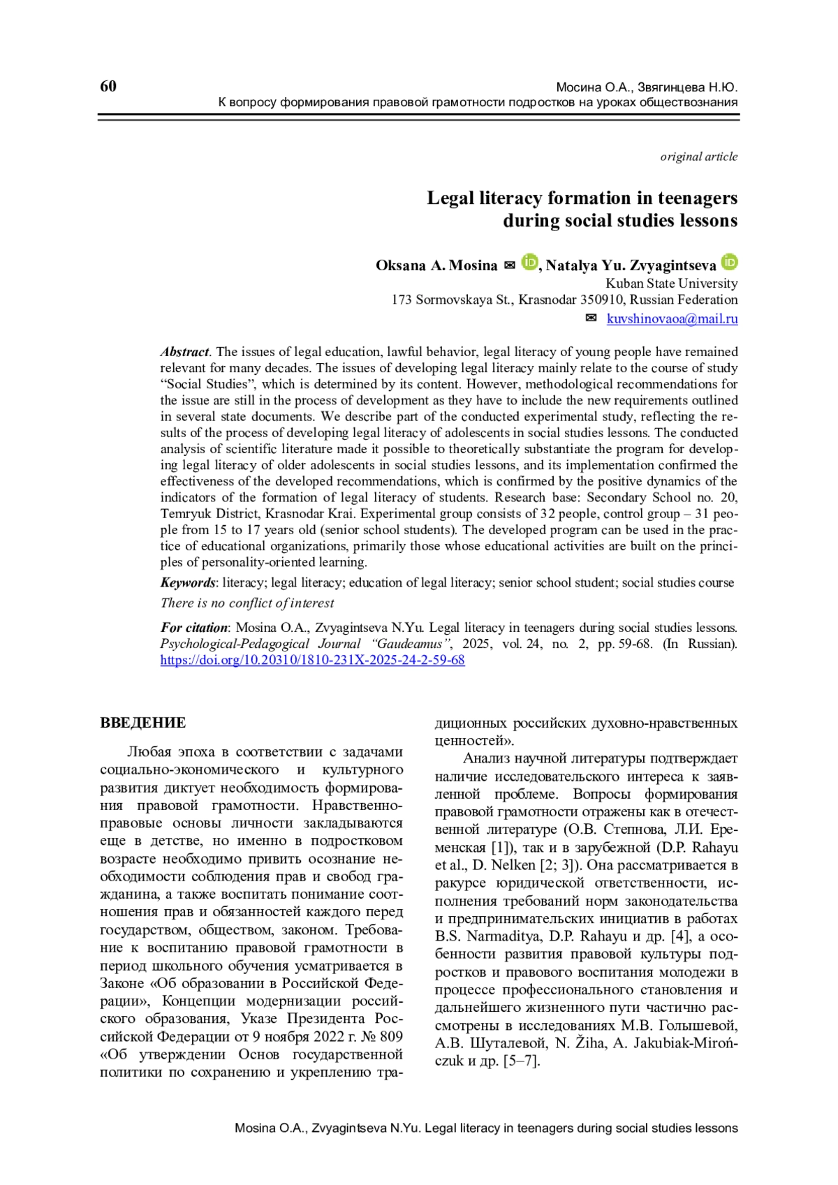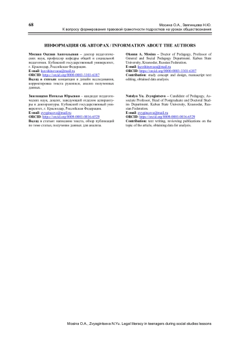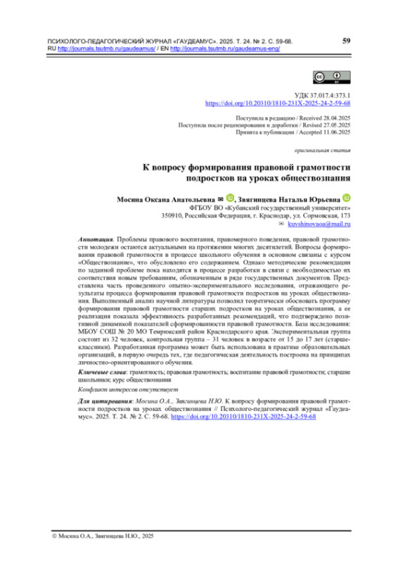 Проблемы правового воспитания, правомерного поведения, правовой грамотности молодежи остаются актуальными на протяжении многих десятилетий. Вопросы формирования правовой грамотности в процессе школьного обучения в основном связаны с курсом «Обществознание», что обусловлено его содержанием. Однако методические рекомендации по заданной проблеме пока находятся в процессе разработки в связи с необходимостью их соответствия новым требованиям, обозначенным в ряде государственных документов. Представлена часть проведенного опытно-экспериментального исследования, отражающего результаты процесса формирования правовой грамотности подростков на уроках обществознания. Выполненный анализ научной литературы позволил теоретически обосновать программу формирования правовой грамотности старших подростков на уроках обществознания, а ее реализация показала эффективность разработанных рекомендаций, что подтверждено позитивной динамикой показателей сформированности правовой грамотности. База исследования: МБОУ СОШ № 20 МО Темрюкский район Краснодарского края. Экспериментальная группа состоит из 32 человек, контрольная группа – 31 человек в возрасте от 15 до 17 лет (старшеклассники). Разработанная программа может быть использована в практике образовательных организаций, в первую очередь тех, где педагогическая деятельность построена на принципах личностно-ориентированного обучения.