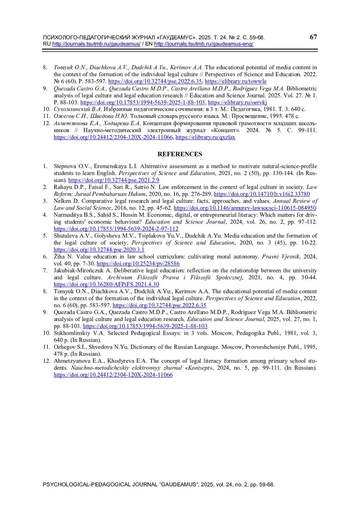 8. Tomyuk O.N., Diachkova A.V., Dudchik A.Yu., Kerimov A.A. The educational potential of media content in the context of the formation of the individual legal culture // Perspectives of Science and Education. 2022. № 6 (60). P. 583-597. ,. DOI: 10.32744/pse.2022.6.35