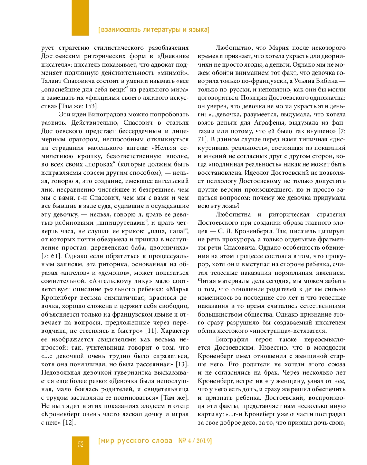 В статье рассматриваются риторические стратегии, использованные Достоевским при интерпретации судебных процессов, в частности, дела Кроненберга (1876), которому посвящен ряд статей в «Дневнике писателя». С помощью микроисторического подхода автор показывает дискурсивные и идеологические причины искажения действительности в этих текстах.