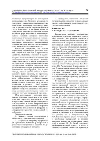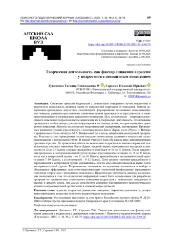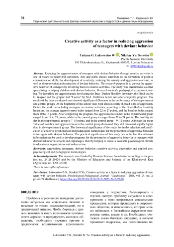 Снижение агрессии подростков с девиантным поведением путем вовлечения в творческую деятельность является одним из направлений коррекции их поведения. Занятия де-коративно-прикладным искусством способствуют формированию позитивных коммуникатив-ных навыков, развитию креативности, снижению уровня тревожности и агрессивности, а также предупреждению и исправлению девиантного поведения. Цель исследования – коррекция агрес-сивного поведения подростков путем вовлечения их в творческую деятельность. Исследование проводилось на базе центра, специализирующегося на помощи детям, которые проявляют деви-антное поведение. Методы исследования: педагогический эксперимент, тестирование. Проводи-лось выявление уровня агрессивности с помощью шкалы Басса–Дарки, теста «Руки» Э. Вагнера и графического теста «Кактус» М. А. Панфиловой до и после завершения реализуемой програм-мы. Результаты трех проведенных тестов показали значительные различия в показателях экспе-риментальной и контрольной групп. В начале учебного года оба класса явно демонстрировали признаки агрессии. До проведения работы по включению подростков в занятия творческой дея-тельностью, согласно опроснику Басса–Дарки, средний индекс агрессивности находился в диа-пазоне от 22 до 27 баллов, а индекс враждебности колебался от 10 до 13 баллов. После заверше-ния программы в экспериментальной группе индекс агрессивности составляет от 18 до 21 балла, тогда как в контрольной группе – от 21 до 24. Индекс враждебности в экспериментальной груп-пе равен 7–10 баллам, а в контрольной – 9–12 баллам. Хотя средние значения враждебности и агрессивности в контрольной группе уменьшились, они все еще остаются несколько выше, чем в экспериментальной группе. Теоретическая значимость исследования заключается в выборе и обосновании эффективных психолого-педагогических технологий профилактики агрессивного поведения подростков с девиантным поведением. Практическая значимость данного исследова-ния заключается в том, что полученная информация может быть использована для разработки программ по профилактике агрессивного поведения подростков с девиантным поведением в школах и детских домах, тем самым способствуя созданию благоприятного психологического климата в образовательной организации и снижению преступности.