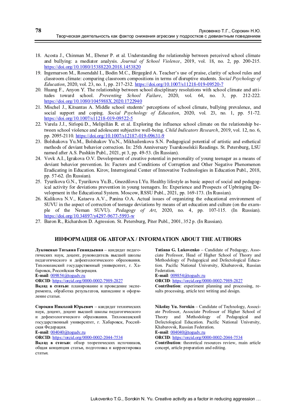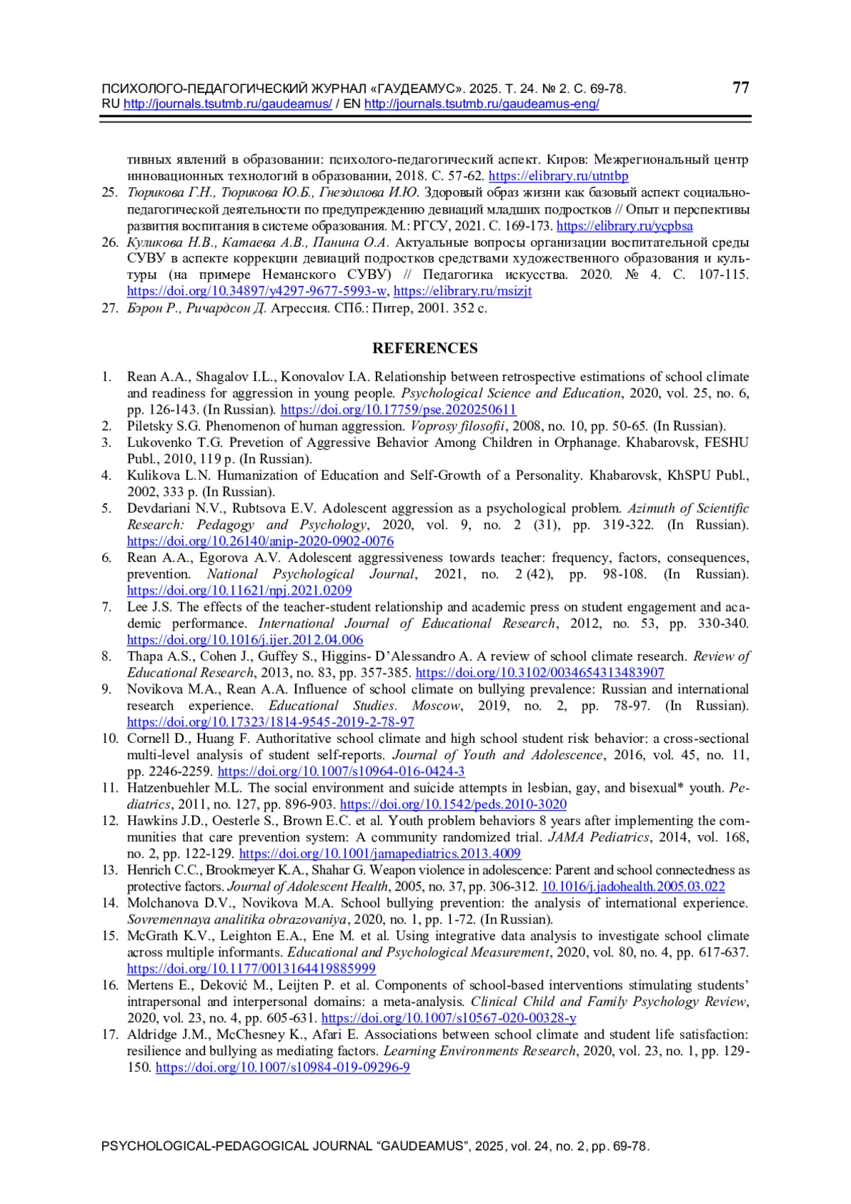 1. Реан А.А., Шагалов И.Л., Коновалов И.А. Связь ретроспективных оценок школьного климата c готовностью молодых людей к агрессии // Психологическая наука и образование. 2020. Т. 25. № 6. С. 126-143. ,. DOI: 10.17759/pse.2020250611