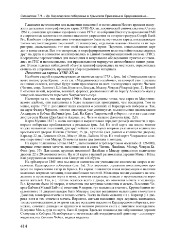 Статья посвящена выявлению исчезнувших в настоящее время поселений и могильников Средневековья и Нового времени в Крымском Приазовье с помощью картографических источников, архивных аэрофотографий, космических снимков и данных археологии. Исследуемая территория включает заповедное Караларское побережье, начинающееся на западе от села Золотое и простирающееся на восток до Чокракского озера, а также восточные берега этого озера и примыкающие урочища.