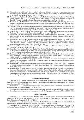 22. Масленников А.А., Смекалова Т.Н., Антипенко А.В., Бейлин Д.В., Гаврилюк А.Н., Деваев А.С. Провожая любимое дитя… РФА серебряных украшений из детских захоронений средневекового некрополя Бабчик-Восточный в Керченском Приазовье // Stratum plus. 2024. № 5. С. 193-208.