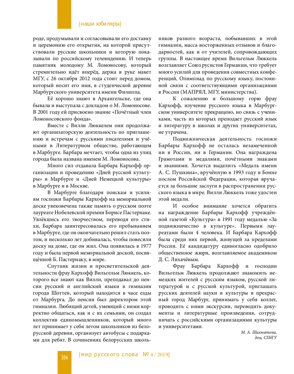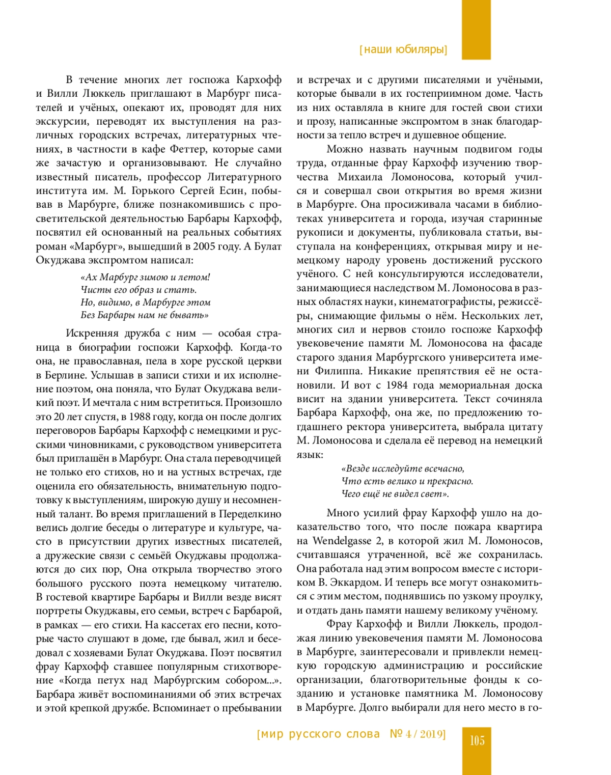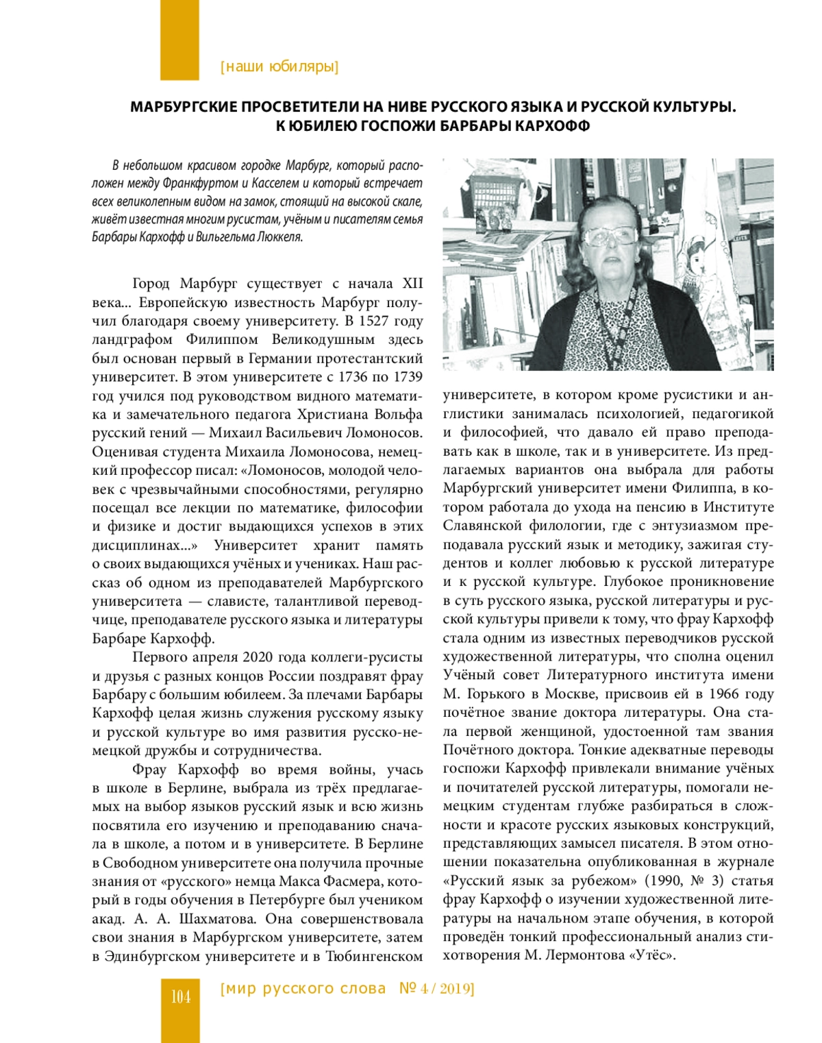 Город Марбург существует с начала XII века… Европейскую известность Марбург получил благодаря своему университету. В 1527 году ландграфом Филиппом Великодушным здесь был основан первый в Германии протестантский университет. В этом университете с 1736 по 1739 год учился под руководством видного математика и замечательного педагога Христиана Вольфа русский гений — Михаил Васильевич Ломоносов. Оценивая студента Михаила Ломоносова, немецкий профессор писал: «Ломоносов, молодой человек с чрезвычайными способностями, регулярно посещал все лекции по математике, философии и физике и достиг выдающихся успехов в этих дисциплинах…» Университет хранит память о своих выдающихся учёных и учениках. Наш рассказ об одном из преподавателей Марбургского университета — слависте, талантливой переводчице, преподавателе русского языка и литературы Барбаре Кархофф.