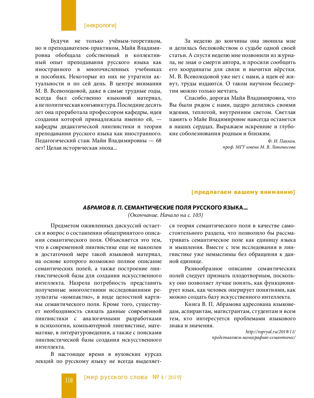 В Москве ушла и з жизни Майя Владимировна Всеволодова, выдающийся учё- ный, заложивший основы функционально-коммуникативного описания русского языка как иностранного, доктор филологических наук, заслуженный профессор Московского государственного университета имени М. В. Ломоносова, почётный профессор Шанхайского университета иностранных языков