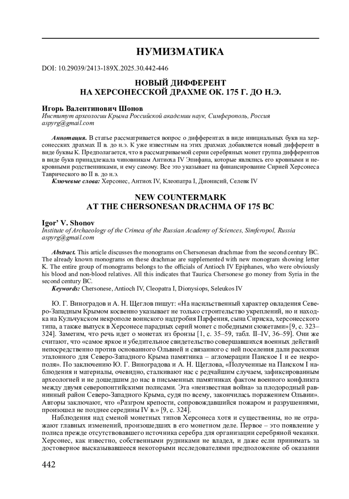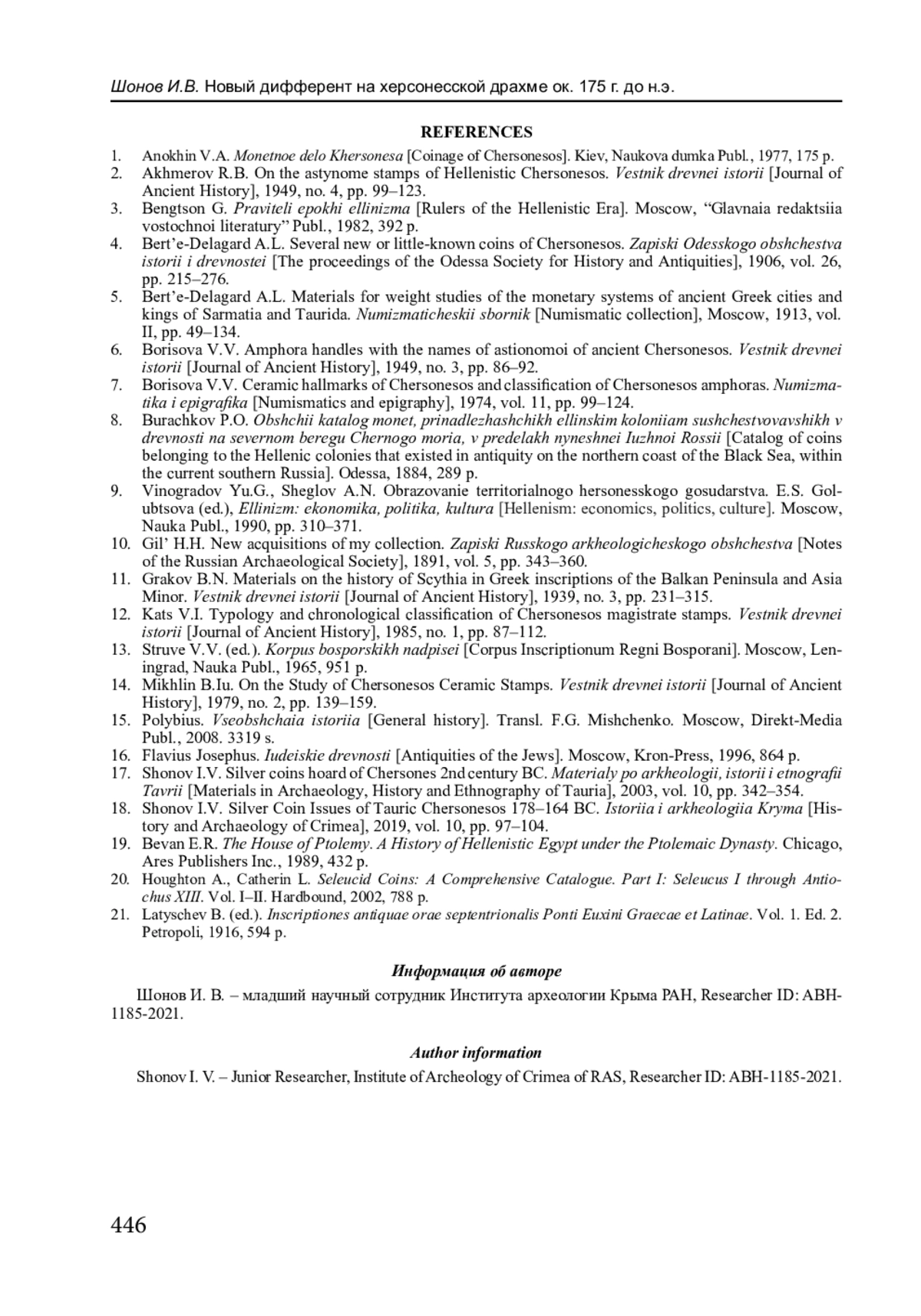 17. Шонов И.В. Клад серебряных херсонесских монет II в. до н.э. // Материалы по археологии, истории и этнографии Таврии. 2003. Вып. X. С. 342-354.