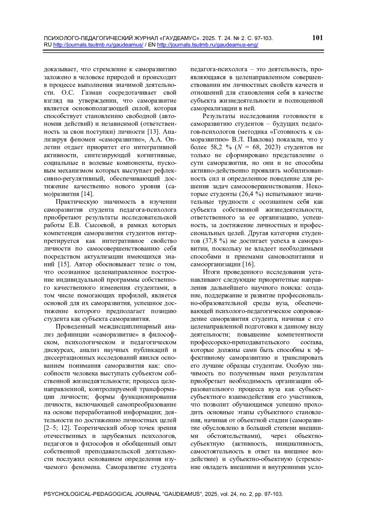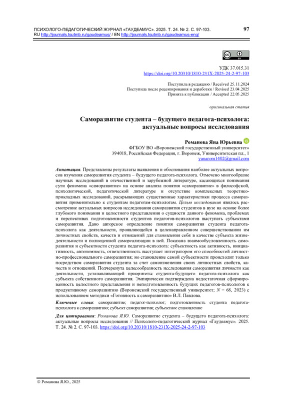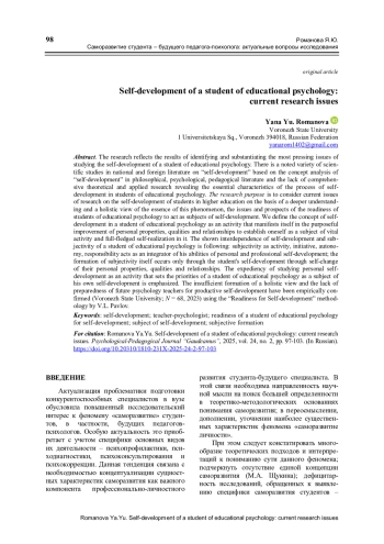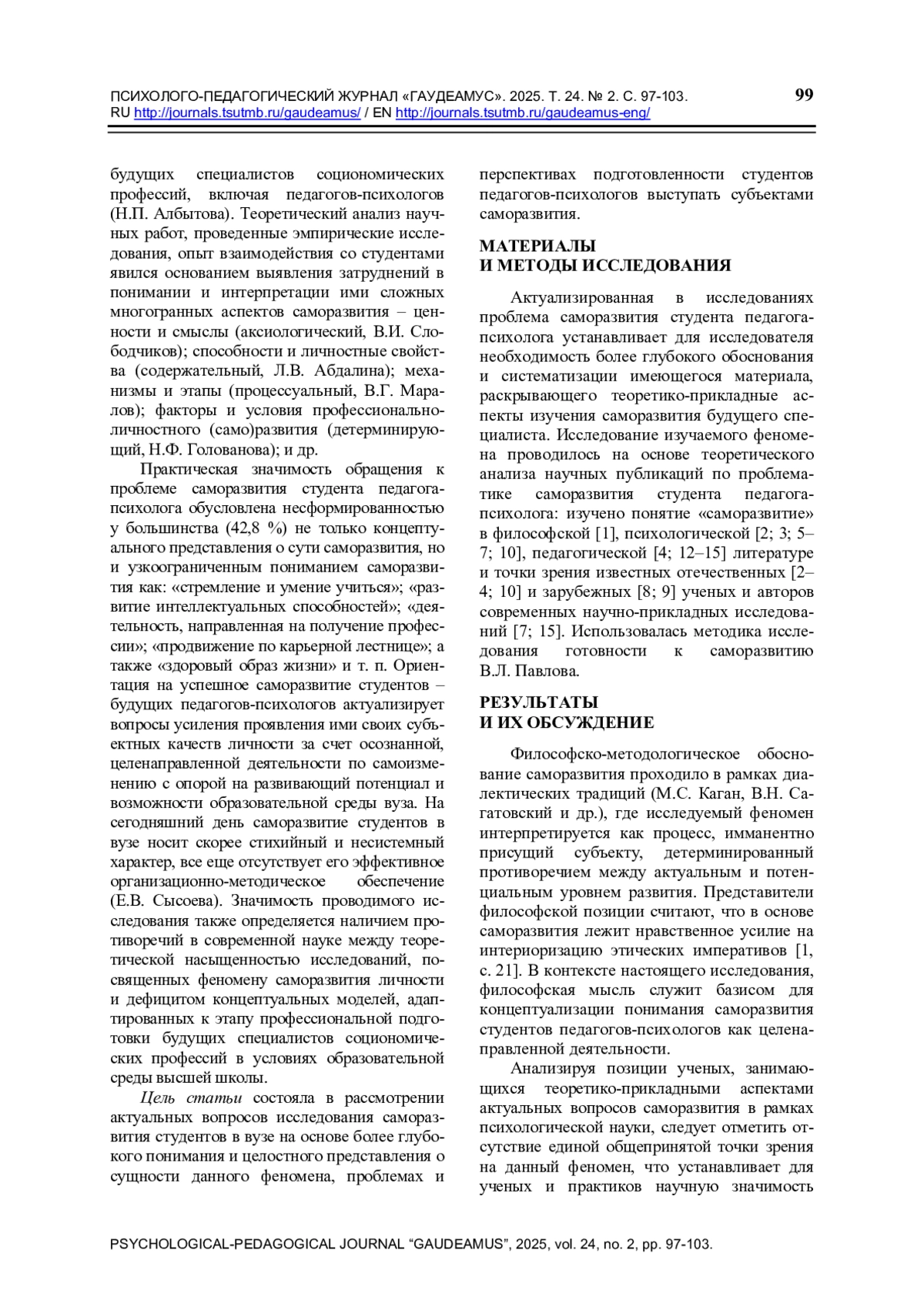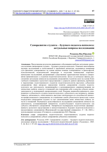 Представлены результаты выявления и обоснования наиболее актуальных вопросов изучения саморазвития студента – будущего педагога-психолога. Отмечено многообразие научных исследований в отечественной и зарубежной литературе, касающихся понимания сути феномена «саморазвитие» на основе анализа понятия «саморазвитие» в философской, психологической, педагогической литературе и отсутствие комплексных теоретикоприкладных исследований, раскрывающих существенные характеристики процесса саморазвития применительно к студентам педагогам-психологам. Целью исследования явилось рассмотрение актуальных вопросов исследования саморазвития студентов в вузе на основе более глубокого понимания и целостного представления о сущности данного феномена, проблемах и перспективах подготовленности студентов педагогов-психологов выступать субъектами саморазвития. Дано авторское определение понятия саморазвития студента педагогапсихолога как деятельности, проявляющейся в целенаправленном совершенствовании им личностных свойств, качеств и отношений для становления себя в качестве субъекта жизнедеятельности и полноценной самореализации в ней. Показана взаимообусловленность саморазвития и субъектности студента педагога-психолога: субъектность как активность, инициативность, автономность, ответственность выступает интегратором его способностей личностно-профессионального саморазвития; но становление самой субъектности происходит только посредством саморазвития студента за счет самоизменения своих личностных свойств, качеств и отношений. Подчеркнута целесообразность исследования саморазвития личности как деятельности, устанавливающей приоритеты студента-будущего педагога-психолога как субъекта собственного саморазвития. Эмпирически подтверждена недостаточная сформированность целостного представления и неподготовленность будущих педагогов-психологов к продуктивному саморазвитию (Воронежский государственный университет; N = 68, 2023) с использованием методики «Готовность к саморазвитию» В. Л. Павлова.