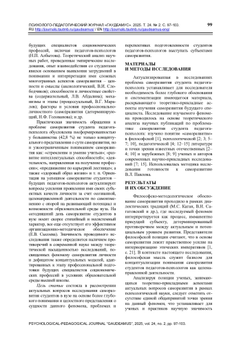 Актуализация проблематики подготовки конкурентоспособных специалистов в вузе обусловила повышенный исследовательский интерес к феномену «саморазвитие» студентов, в частности, будущих педагоговпсихологов. Особую актуальность это приобретает с учетом специфики основных видов их деятельности – психопрофилактики, психодиагностики, психоконсультирования и психокоррекции. Данная тенденция связана с необходимостью концептуализации сущностных характеристик саморазвития как важного компонента профессионально-личностного развития студента-будущего специалиста. В этой связи необходима направленность научной мысли на поиск большей определенности в теоретико-методологических основаниях понимания саморазвития; в переосмыслении, дополнении, уточнении наиболее существенных характеристик феномена «саморазвитие личности».