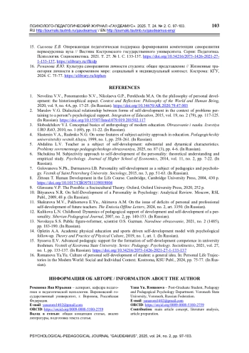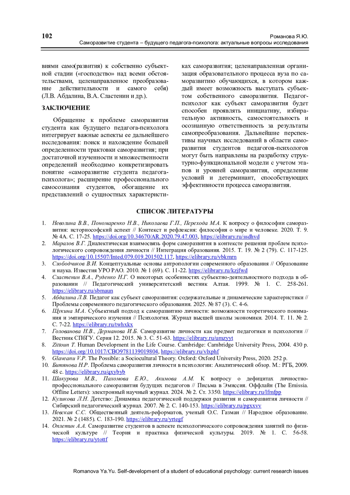 16. Романова Я.Ю. Культура саморазвития личности студента: общее представление // Жизненные траектории личности в современном мире: социальный и индивидуальный контекст. Кострома: КГУ, 2024. С. 75-77.