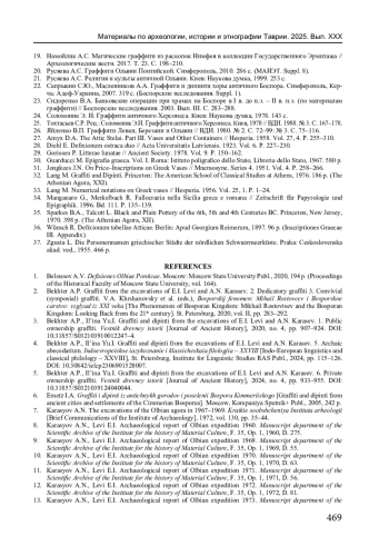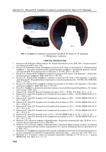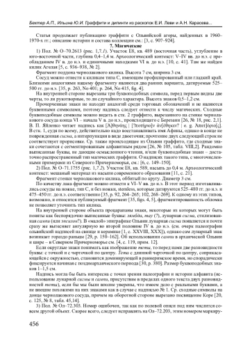 3. Бехтер А.П., Ильина Ю.И. Граффити и дипинти из раскопок Е.И. Леви и А.Н. Карасева: 1. Общественно-владельческие граффити // Вестник древней истории. 2020. № 4. С. 907-924. EDN: DATOWM