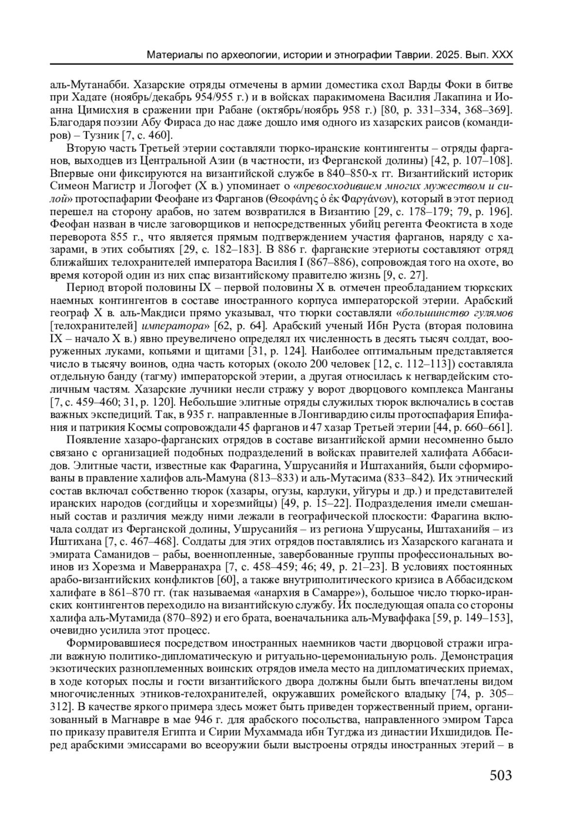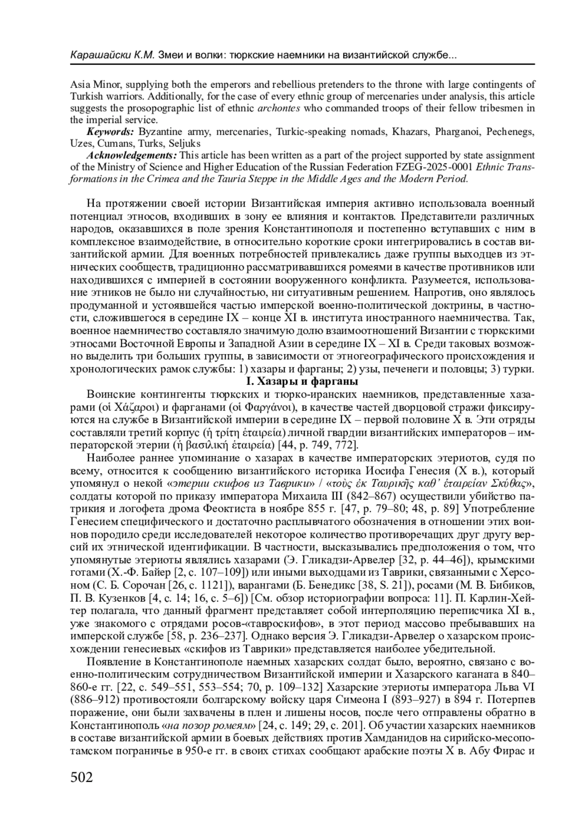 12. Карашайски К.М. Тюрки в гвардии византийских императоров в середине IX - первой половине X в. // TERRA TATARICA: Крым и тюркский мир в эпоху Средневековья и в Новое время (Симферополь, 10-12 октября 2023 г.): Мат-лы науч. конф. Симферополь: Ариал, 2023. С. 112-118. EDN: EEMMFW