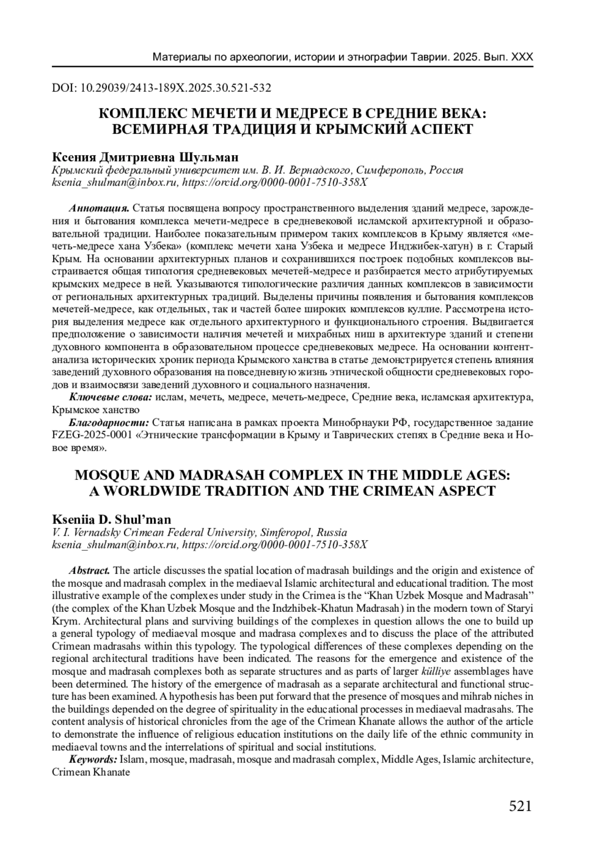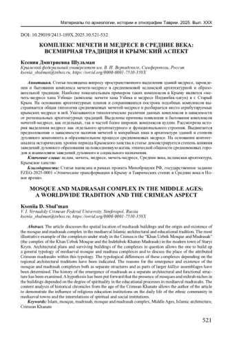 Статья посвящена вопросу пространственного выделения зданий медресе, зарождения и бытования комплекса мечети-медресе в средневековой исламской архитектурной и образовательной традиции. Наиболее показательным примером таких комплексов в Крыму является «мечеть-медресе хана Узбека» (комплекс мечети хана Узбека и медресе Инджибек-хатун) в г. Старый Крым. На основании архитектурных планов и сохранившихся построек подобных комплексов выстраивается общая типология средневековых мечетей-медресе и разбирается место атрибутируемых крымских медресе в ней. Указываются типологические различия данных комплексов в зависимости от региональных архитектурных традиций. Выделены причины появления и бытования комплексов мечетей-медресе, как отдельных, так и частей более широких комплексов куллие. Рассмотрена история выделения медресе как отдельного архитектурного и функционального строения. Выдвигается предположение о зависимости наличия мечетей и михрабных ниш в архитектуре зданий и степени духовного компонента в образовательном процессе средневековых медресе. На основании контент-анализа исторических хроник периода Крымского ханства в статье демонстрируется степень влияния заведений духовного образования на повседневную жизнь этнической общности средневековых городов и взаимосвязи заведений духовного и социального назначения.