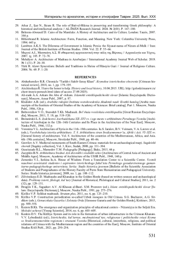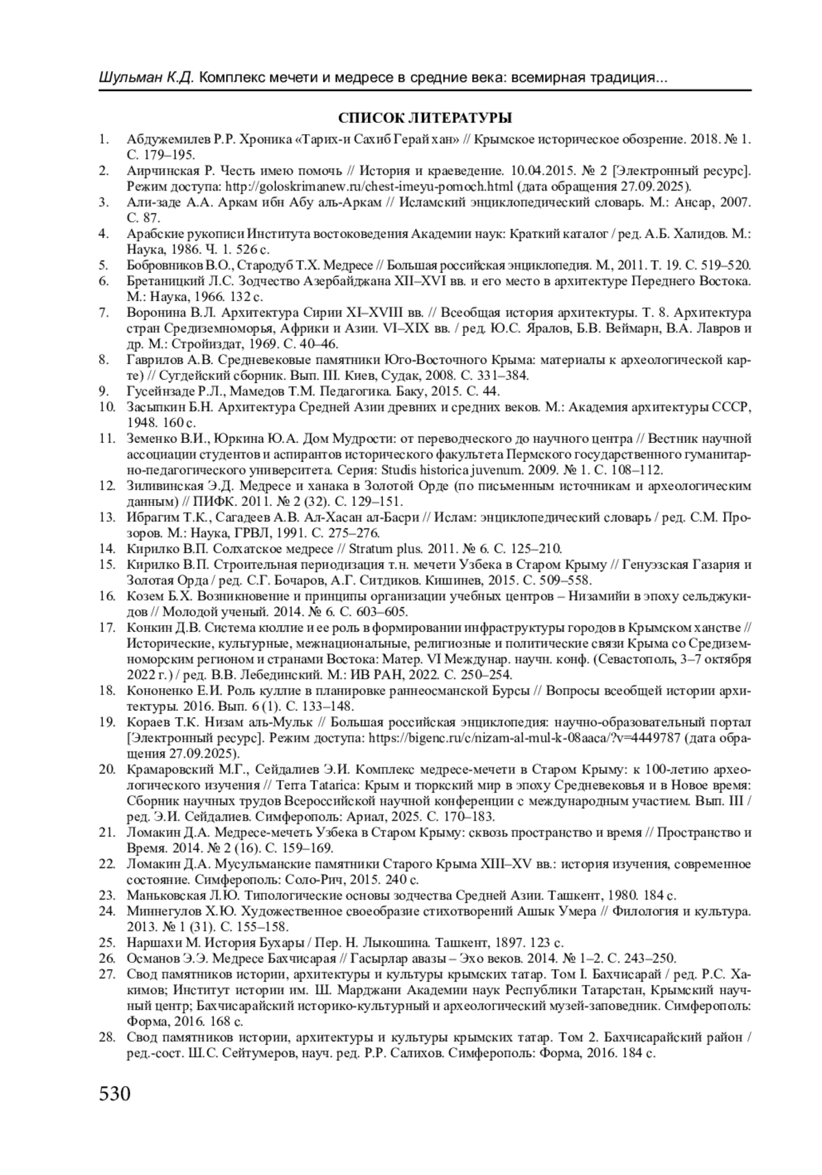 26. Османов Э.Э. Медресе Бахчисарая // Гасырлар авазы - Эхо веков. 2014. № 1-2. С. 243-250.