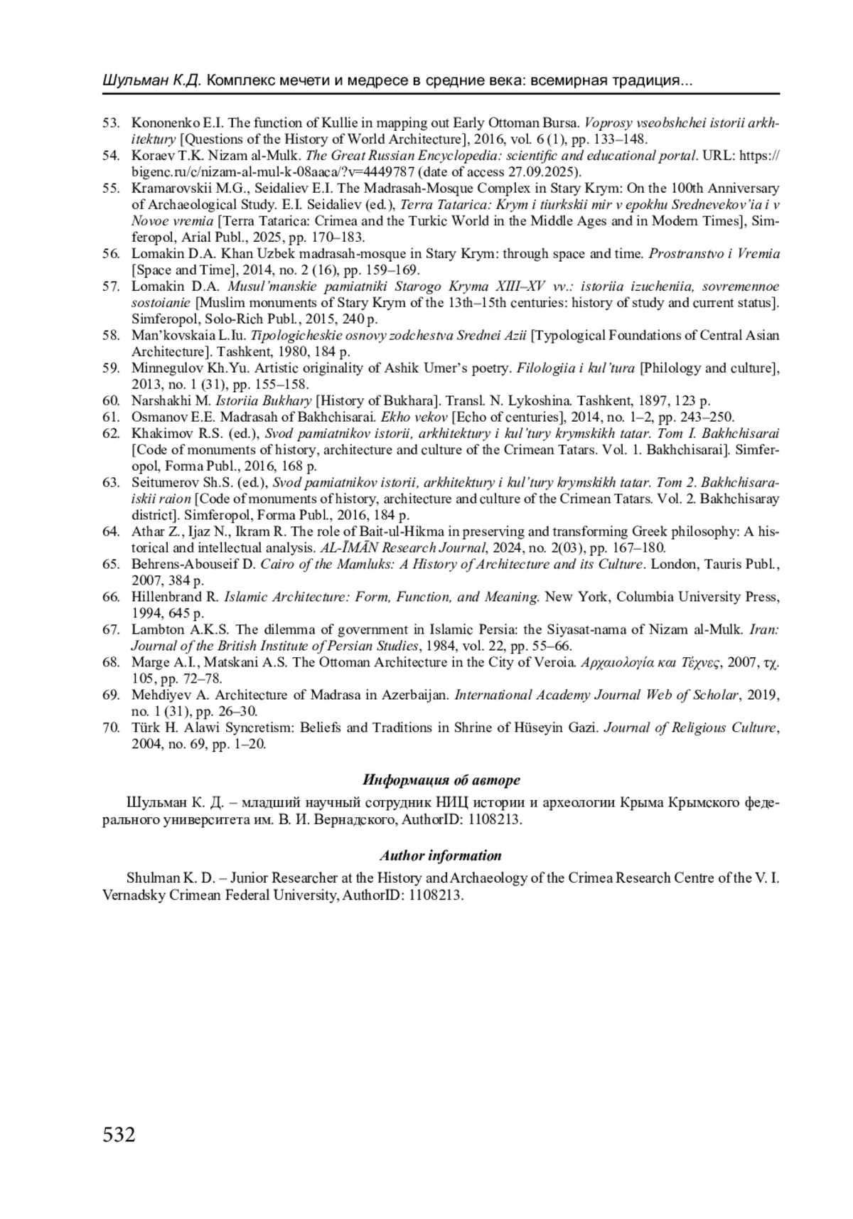21. Ломакин Д.А. Медресе-мечеть Узбека в Старом Крыму: сквозь пространство и время // Пространство и Время. 2014. № 2 (16). С. 159-169. EDN: SJEGBV
