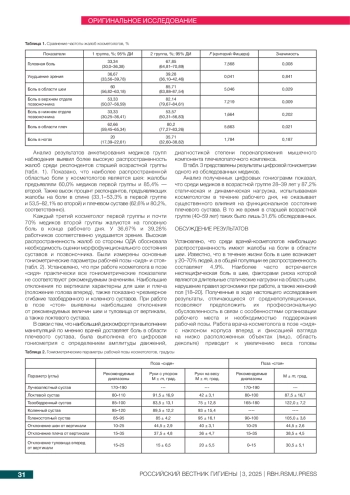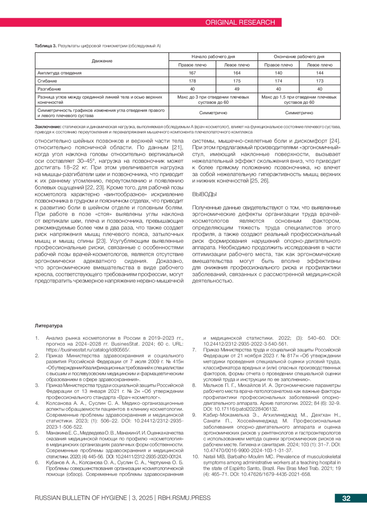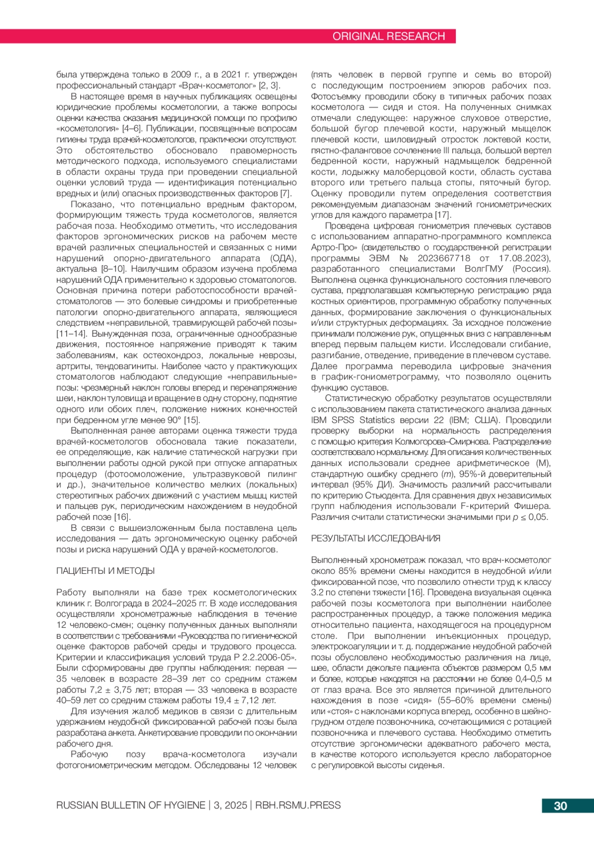 В настоящее время косметология является одной самых быстроразвивающихся отраслей медицины. При этом потенциально вредными факторами, формирующими тяжесть труда косметологов, являются статическая нагрузка, мелкие стереотипные рабочие движения, периодическое нахождение в неудобной рабочей позе. Целью исследования было выполнить эргономическую оценку рабочей позы и риска нарушений опорно-двигательного аппарата у врачей-косметологов. Изучены жалобы медиков в связи с длительным удержанием неудобной фиксированной рабочей позы. Рабочую позу оценивали фотогониометрическим методом с последующим построением эпюров рабочих поз «сидя» и «стоя». Выполнена цифровая гониометрия плечевых суставов с использованием аппаратно-программного комплекса «Артро-Про». Установлено, что врач-косметолог около 85% времени смены находится в неудобной и/или фиксированной позе, что соответствует классу 3.2 по степени тяжести. Среди врачей-косметологов наибольшую распространенность имеют жалобы на боли в области шеи (60,0–85,4%), в спине (33,1–82,1%), в плечевом суставе (62,6–80,2%). Цифровая гониометрия показала, что во время работы косметолога в позе «сидя» практически все гониометрические показатели не соответствуют рекомендуемым значениям. При работе в позе «стоя» выявлены наибольшие отклонения в области шеи и туловища, а также локтевого сустава, особенно в старшей возрастной группе (p ≤ 0,05). Таким образом, усугубляющим фактором, связанным с особенностями рабочей позы врачей-косметологов, является отсутствие эргономически адекватного сидения, что создает реальный профессиональный риск формирования нарушений опорно-двигательного аппарата.