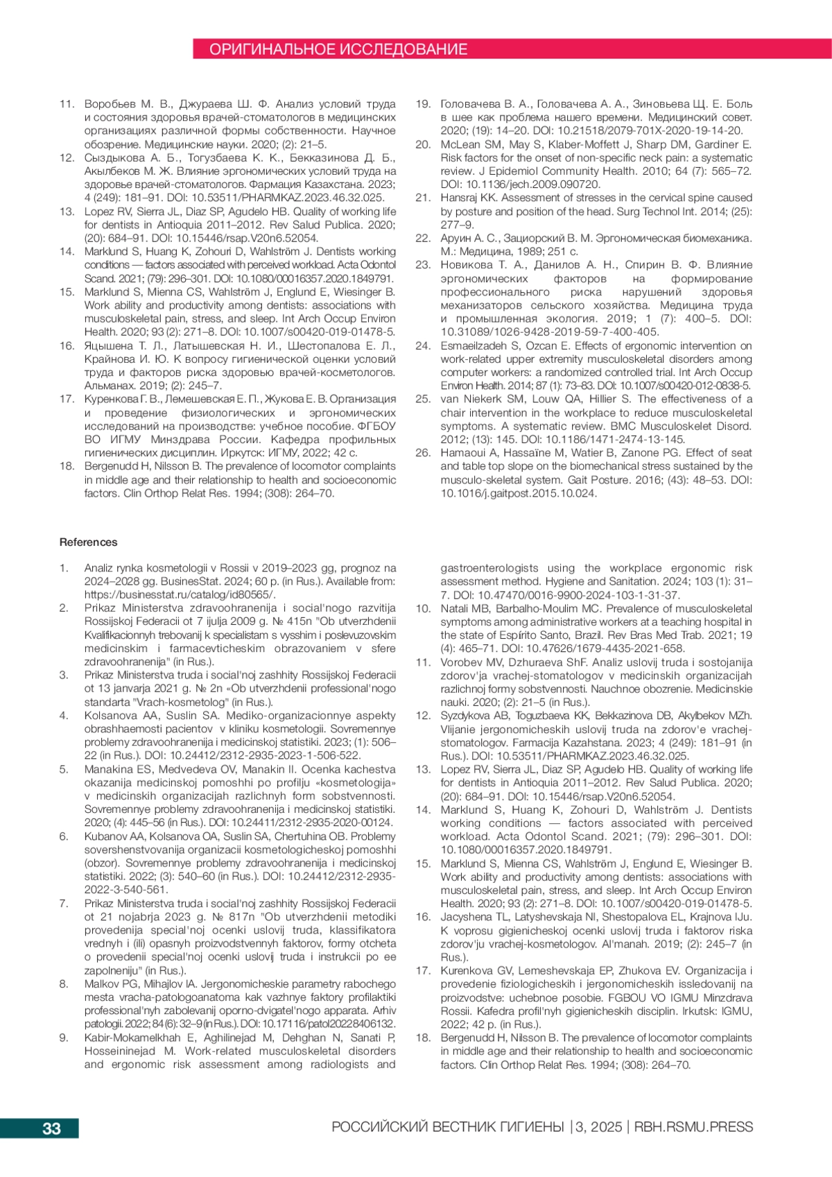 12. Сыздыкова А. Б., Тогузбаева К. К., Бекказинова Д. Б., Акылбеков М. Ж. Влияние эргономических условий труда на здоровье врачей-стоматологов. Фармация Казахстана. 2023; 4 (249): 181-91. DOI: 10.53511/PHARMKAZ.2023.46.32.025