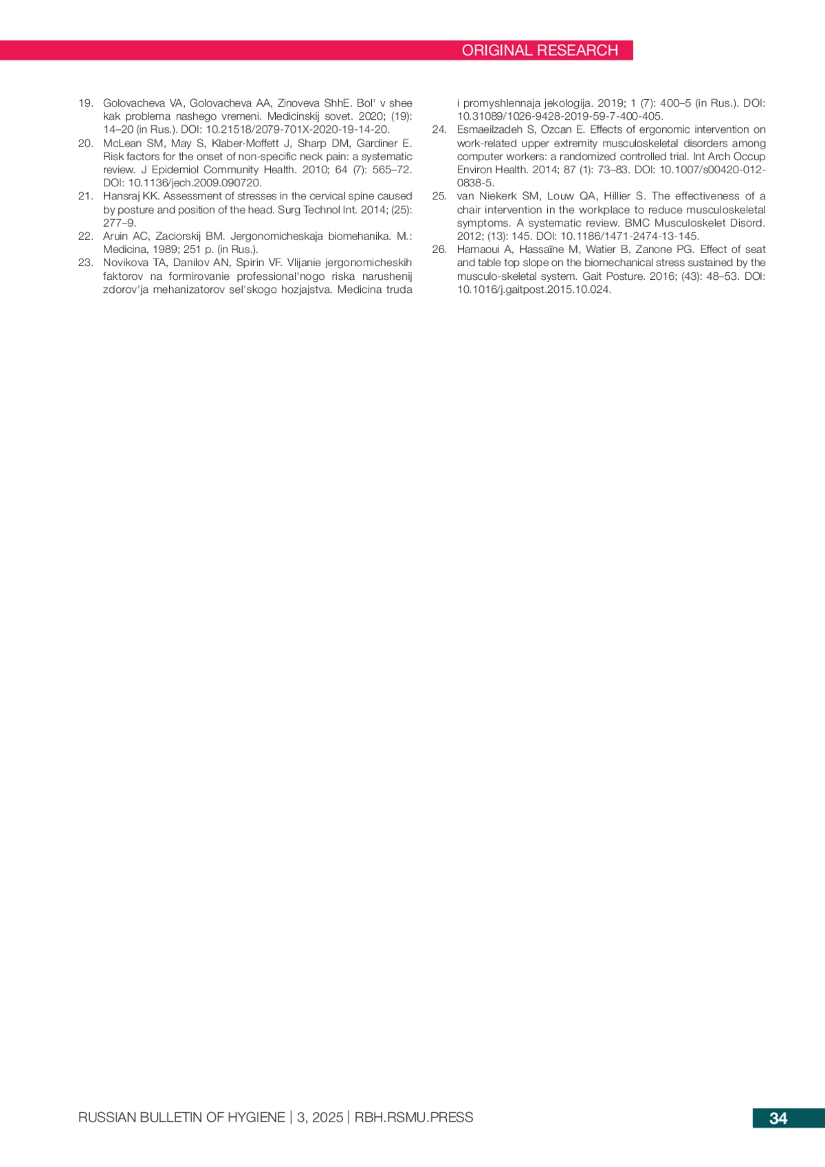 9. Кабир-Мокамельха Э., Агхилинеджад М., Дехгхан Н., Санати П., Хоссейнинеджад М. Профессиональные заболевания опорно-двигательного аппарата и оценка эргономических рисков у рентгенологов и гастроэнтерологов с использованием метода оценки эргономических рисков на рабочем месте. Гигиена и санитария. 2024; 103 (1): 31-7. DOI: 10.47470/0016-9900-2024-103-1-31-37