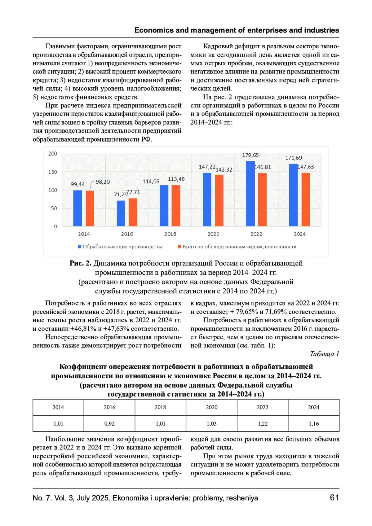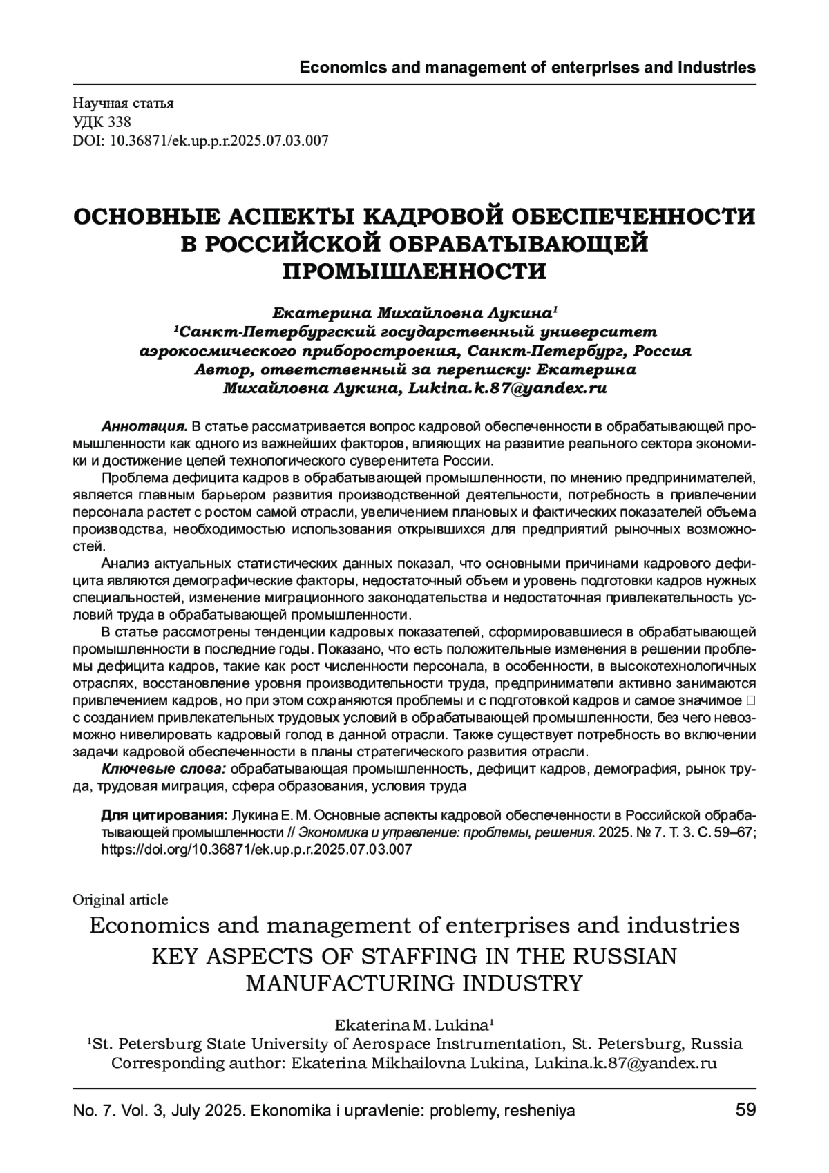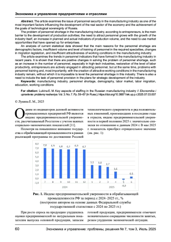 В статье рассматривается вопрос кадровой обеспеченности в обрабатывающей промышленности как одного из важнейших факторов, влияющих на развитие реального сектора экономики и достижение целей технологического суверенитета России. Проблема дефицита кадров в обрабатывающей промышленности, по мнению предпринимателей, является главным барьером развития производственной деятельности, потребность в привлечении персонала растет с ростом самой отрасли, увеличением плановых и фактических показателей объема производства, необходимостью использования открывшихся для предприятий рыночных возможностей. Анализ актуальных статистических данных показал, что основными причинами кадрового дефицита являются демографические факторы, недостаточный объем и уровень подготовки кадров нужных специальностей, изменение миграционного законодательства и недостаточная привлекательность условий труда в обрабатывающей промышленности. В статье рассмотрены тенденции кадровых показателей, сформировавшиеся в обрабатывающей промышленности в последние годы. Показано, что есть положительные изменения в решении проблемы дефицита кадров, такие как рост численности персонала, в особенности, в высокотехнологичных отраслях, восстановление уровня производительности труда, предприниматели активно занимаются привлечением кадров, но при этом сохраняются проблемы и с подготовкой кадров и самое значимое - с созданием привлекательных трудовых условий в обрабатывающей промышленности, без чего невозможно нивелировать кадровый голод в данной отрасли. Также существует потребность во включении задачи кадровой обеспеченности в планы стратегического развития отрасли.