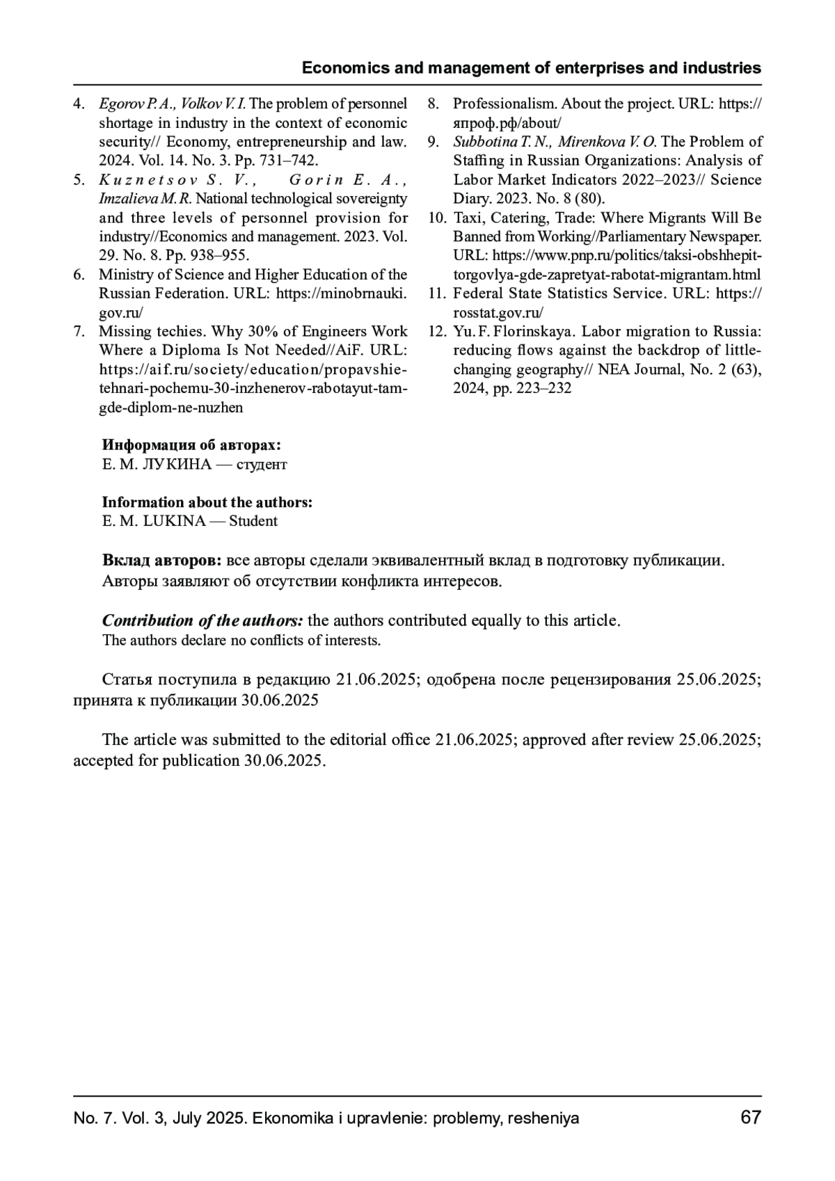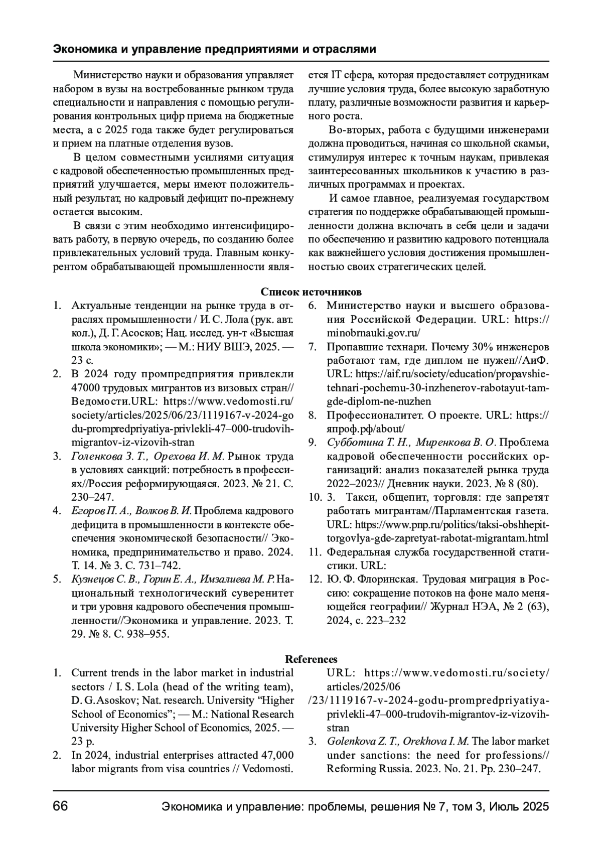 4. Егоров П. А., Волков В. И. Проблема кадрового дефицита в промышленности в контексте обеспечения экономической безопасности// Экономика, предпринимательство и право. 2024. Т. 14. № 3. С. 731-742. EDN: BZYULW