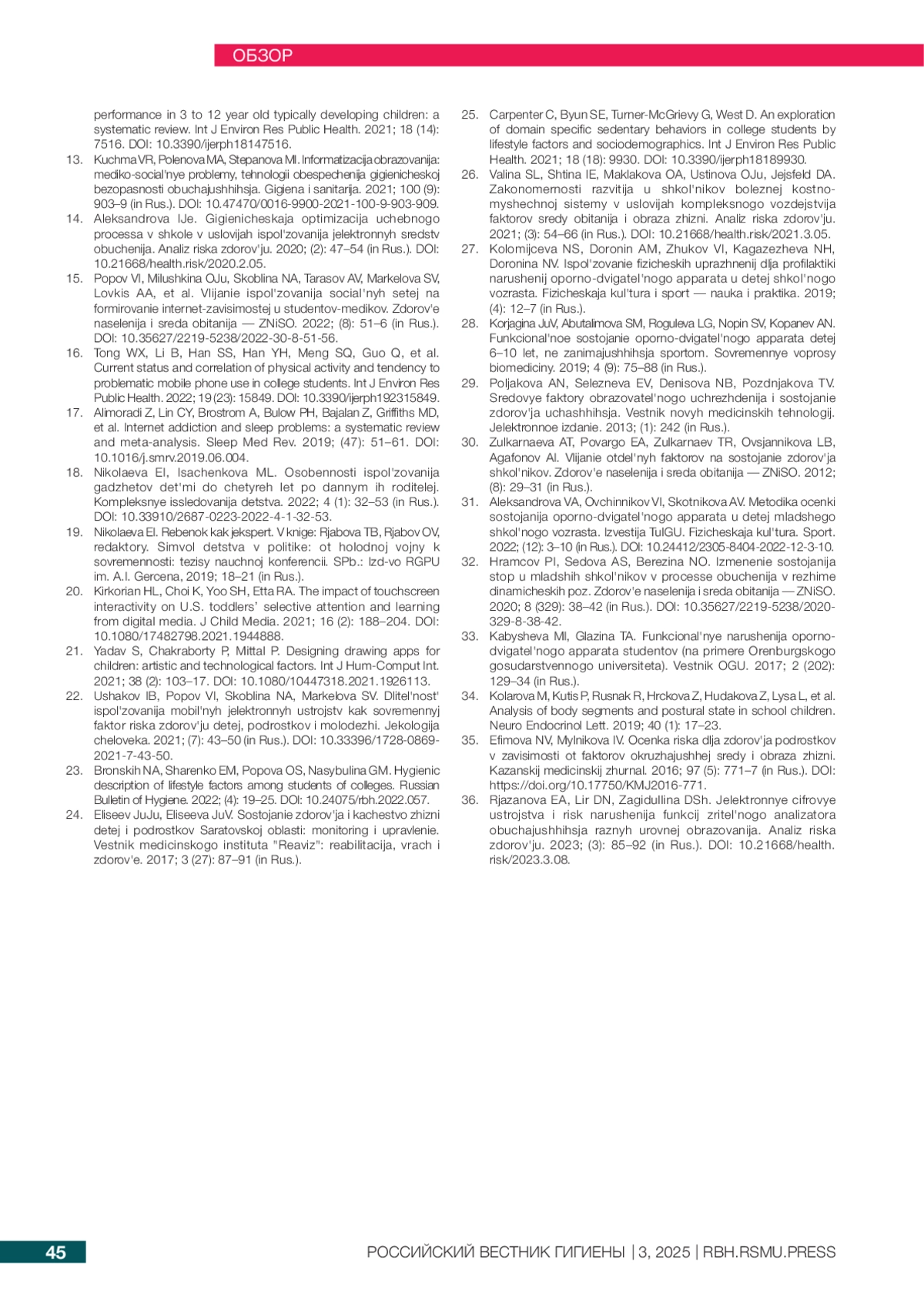 36. Рязанова Е. А., Лир Д. Н., Загидуллина Д. Ш. Электронные цифровые устройства и риск нарушения функций зрительного анализатора обучающихся разных уровней образования. Анализ риска здоровью. 2023; (3): 85-92.