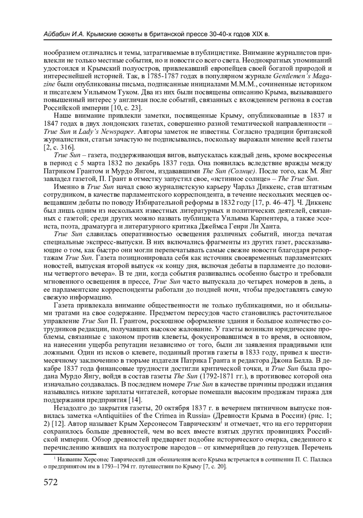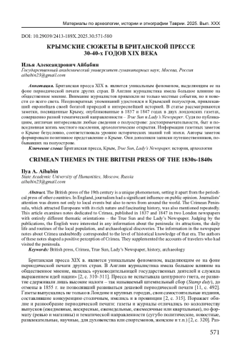 В Англии журналистика имела большое влияние на общественное мнение. Внимание журналистов привлекли не только местные события, но и новости со всего света. Неоднократных упоминаний удостоился и Крымский полуостров, привлекавший европейцев своей богатой природой и интереснейшей историей. В статье рассматриваются заметки, посвященные Крыму, опубликованные в 1837 и 1847 годах в двух лондонских газетах, совершенно разной тематической направленности - True Sun и Lady’s Newspaper. Судя по публикациям, англичан интересовали любые сведения о полуострове: достопримечательности, быт и повседневная жизнь местного населения, археологические открытия. Информация газетных заметок о Крыме безусловно, соответствовала уровню исторических знаний той эпохи. Авторы заметок формировали позитивное представление о Крыме. Они дополняли записки путешественников, побывавших на полуострове.