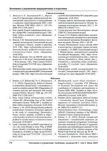 3. Имаева Л. М. Экономический подход к исследованию волонтерства [Электронный ресурс]// Экономика и бизнес: теория и практика.2019. URL: https://cyberleninka.ru/article/n/ekonomicheskiy-podhod-k-issledovaniyuvolonterstva/viewer (дата обращения:16.06.2025). EDN: BLESRE