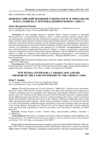 В статье впервые вводится в научный оборот «Записка генерала от кавалерии Михельсона И. И. о землевладении в Крыму» (1802 г.). Автор документа известен, прежде всего, как военачальник, ключевой участник подавления пугачевского восстания. Но помимо военной карьеры некоторое время являлся военным губернатором Новороссийской губернии. В качестве регионального начальника большое внимание уделял проблеме крымского землевладения, связанной с нелегитимными раздачами земель российским помещикам. В представленной «Записке» Михельсон излагает суть проблемы и предлагает свои варианты по ее решению, квалифицированно апеллируя к законодательным инициативам Екатерины II и Павла I, а также к исторически сложившимся обычаям и порядкам в системе землевладения времен Крымского ханства. Важным обстоятельством является тот факт, что «Записка» была прочитана императором Александром I, а затем передана в специализированный орган по преобразованию региона - Новороссийский Комитет - для дальнейшего обсуждения.