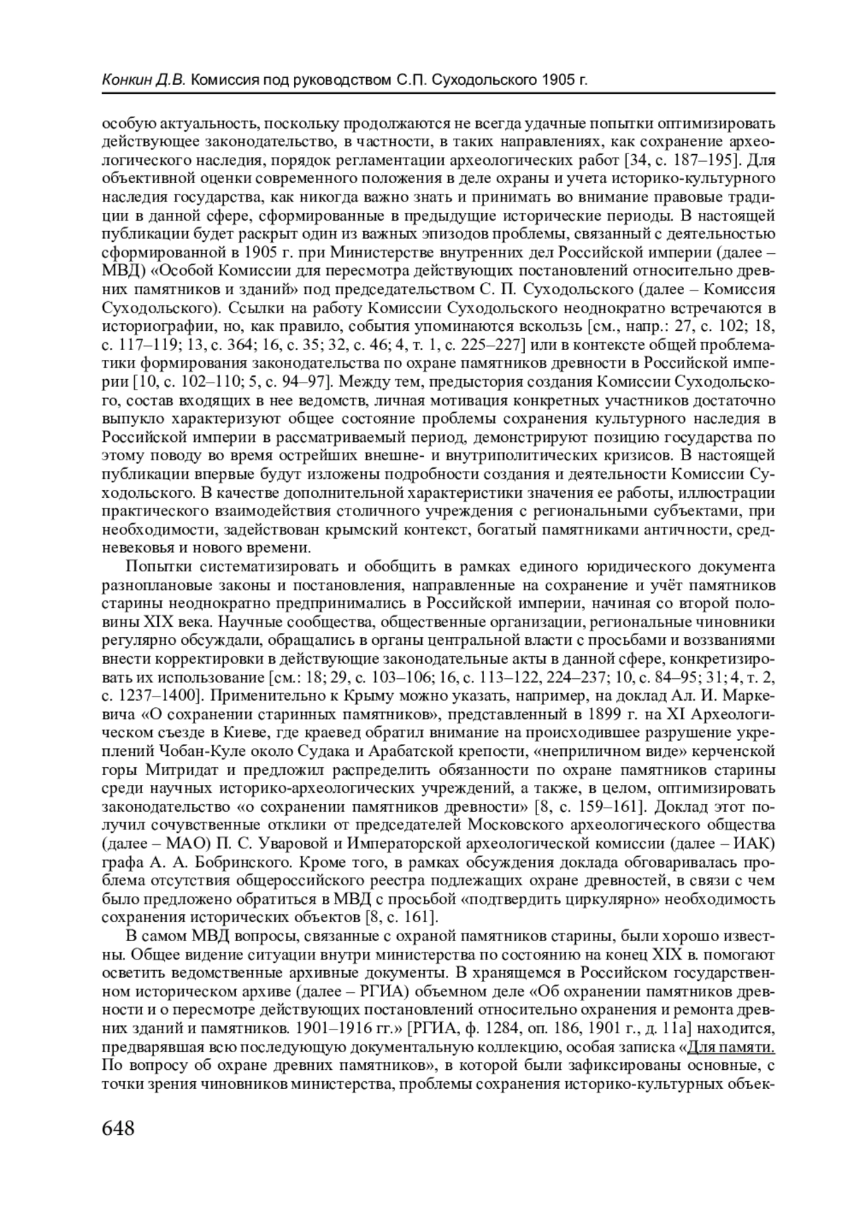 С. П. Суходольского. Данная Комиссия была учреждена в 1905 г. в Санкт-Петербурге при МВД с целью систематизации и выработки единого законодательного проекта по охране памятников древности Российской империи. В ее работе были задействованы ведущие специалисты и ответственные чиновники, хорошо знакомые с данной тематикой, включая таких известных общественных, научных и государственных деятелей, как А. А. Бобринской, Н. П. Кондаков, Н. В. Султанов, П. Ю. Сюзор, Н. В. Покровский и др. Несмотря на краткость своего функционирования, несовпадение взглядов ее членов на ряд ключевых параметров проблемы, выработанные Комиссией «Особые Положения» стали важным заделом в последовавшие позднее попытки государственной власти создать всеобъемлющий законодательный документ по охране культурного наследия в Российской империи. Обсуждаемые на заседаниях вопросы являлись срезом общественных и государственных представлений по ключевой проблематике в рассматриваемый период.