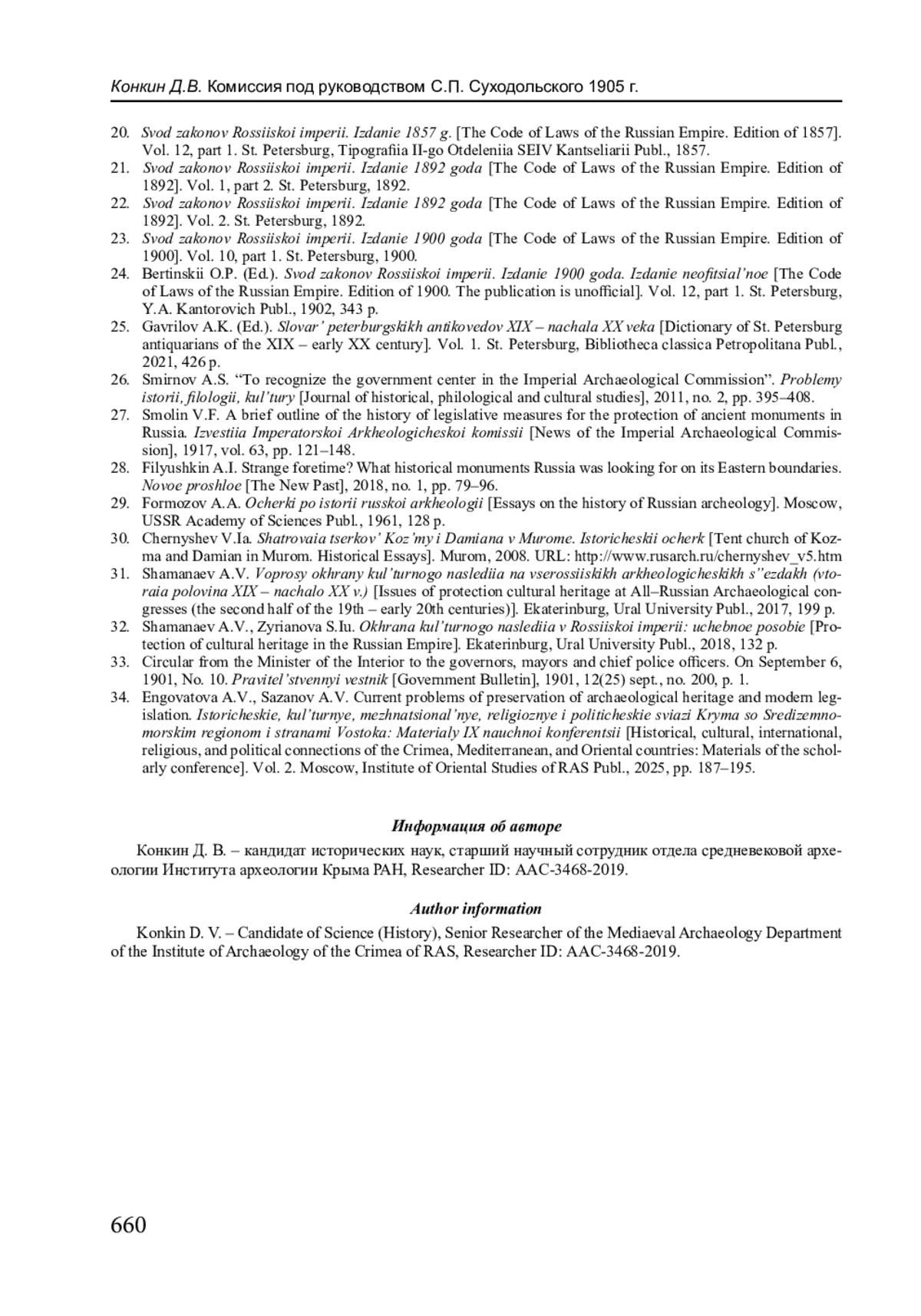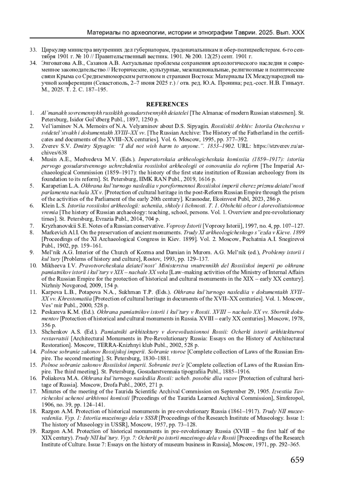 34. Энговатова А.В., Сазанов А.В. Актуальные проблемы сохранения археологического наследия и современное законодательство // Исторические, культурные, межнациональные, религиозные и политические связи Крыма со Средиземноморским регионом и странами Востока: Материалы IX Международной научной конференции (Севастополь, 2-7 июня 2025 г.) / отв. ред. Ю.А. Пронина; ред.-сост. Н.В. Гинькут. М., 2025. Т. 2. С. 187-195.