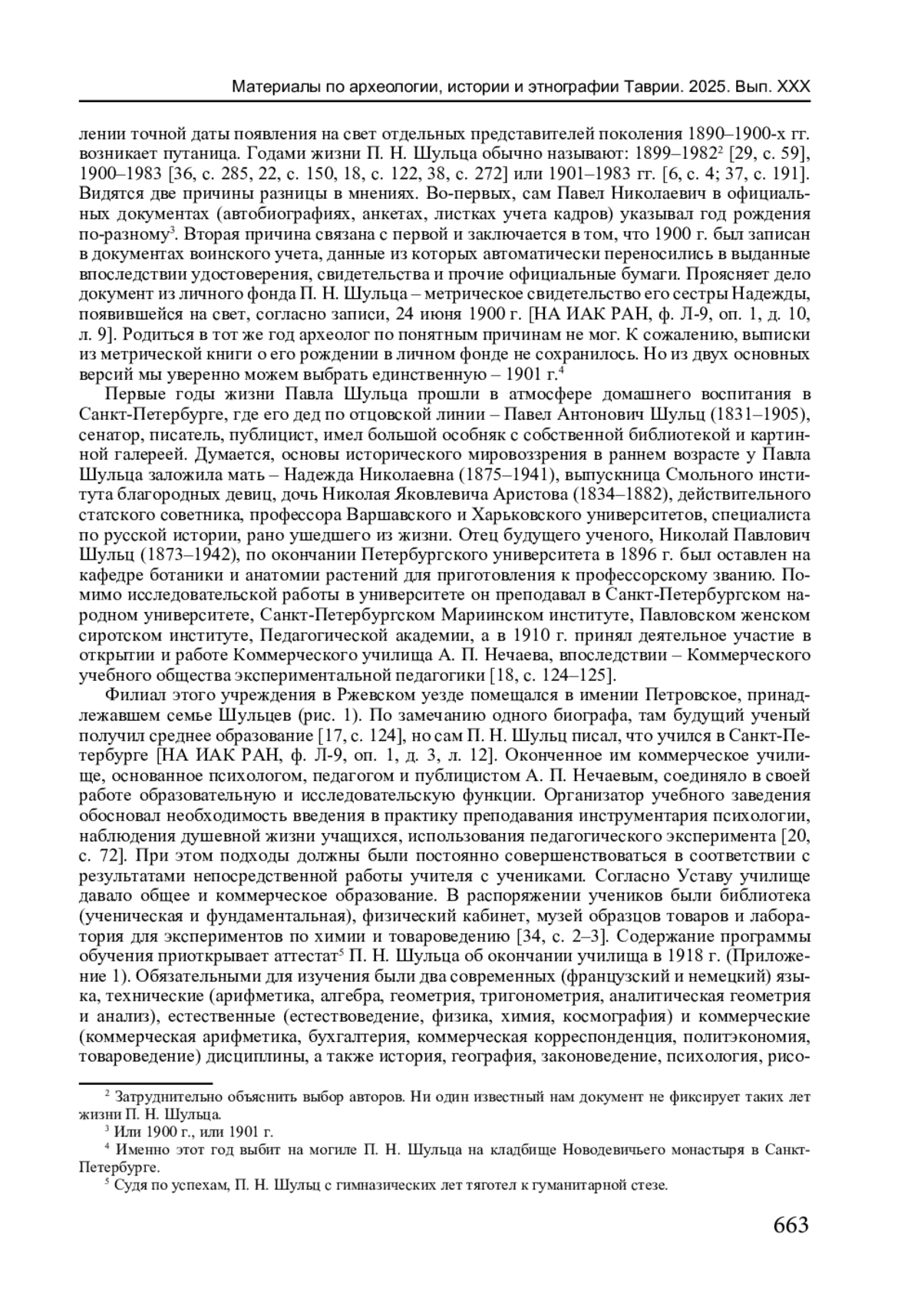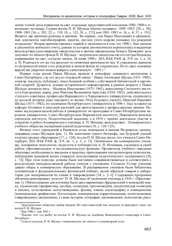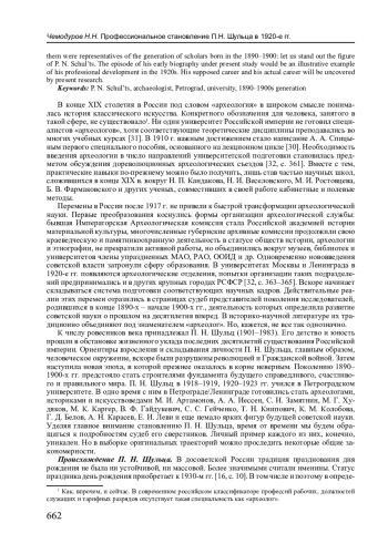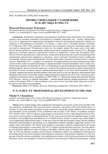 Подлинное понимание многогранного развития науки невозможно без контекстуального учета мотивов, решений и поступков его основных движущих сил - ученых. Представляется, что от правильности современного восприятия личности исследователя прошлого зависит истинность и обоснованность суждений о его вкладе, а также месте в истории научного познания. П. Н. Шульца (1901-1983) называют археологом или историком искусства. Насколько верно одно или другое определение? Очевидность ответа на этот вопрос мнима. На самом деле, в нем скрывается важная проблема модернизации профессиональной специализации ученого ХХ в. Виденье археолога столетней давности существенно отлично от принятого в наши дни. На рубеже XIX-ХХ вв. в России продолжалось теоретическое осмысление археологии как самостоятельной научной дисциплины, предлагались варианты ее предмета, задач и методов. Усилиями ученого сообщества создавались предпосылки возникновения системы подготовки специалистов-археологов в университетах. Революция 1917 г. ускорила эти процессы. Государственная идеология материализма определила новые задачи исторической науки, в инструментарии которой важнейшее место заняло изучение вещественных источников. В 1919 г. в Петрограде на организационном фундаменте бывшей Императорской Археологической комиссии создается Российская академия истории материальной культуры. Ее штат составили деятели дореволюционной науки, но их число было невелико. Последующие административные преобразования советской власти в системе высшего образования были призваны обеспечить подготовку новых кадров археологов-марксистов. В их числе оказались представители поколения ученых, родившихся в 1890-1900-е гг. Среди ровесников века выделим фигуру П. Н. Шульца. Эпизод его ранней биографии - показательный пример профессионального становления в обстановке 1920-х гг. Кем готовился стать и кем в итоге стал наш герой, предстоит узнать в результате настоящего исследования.