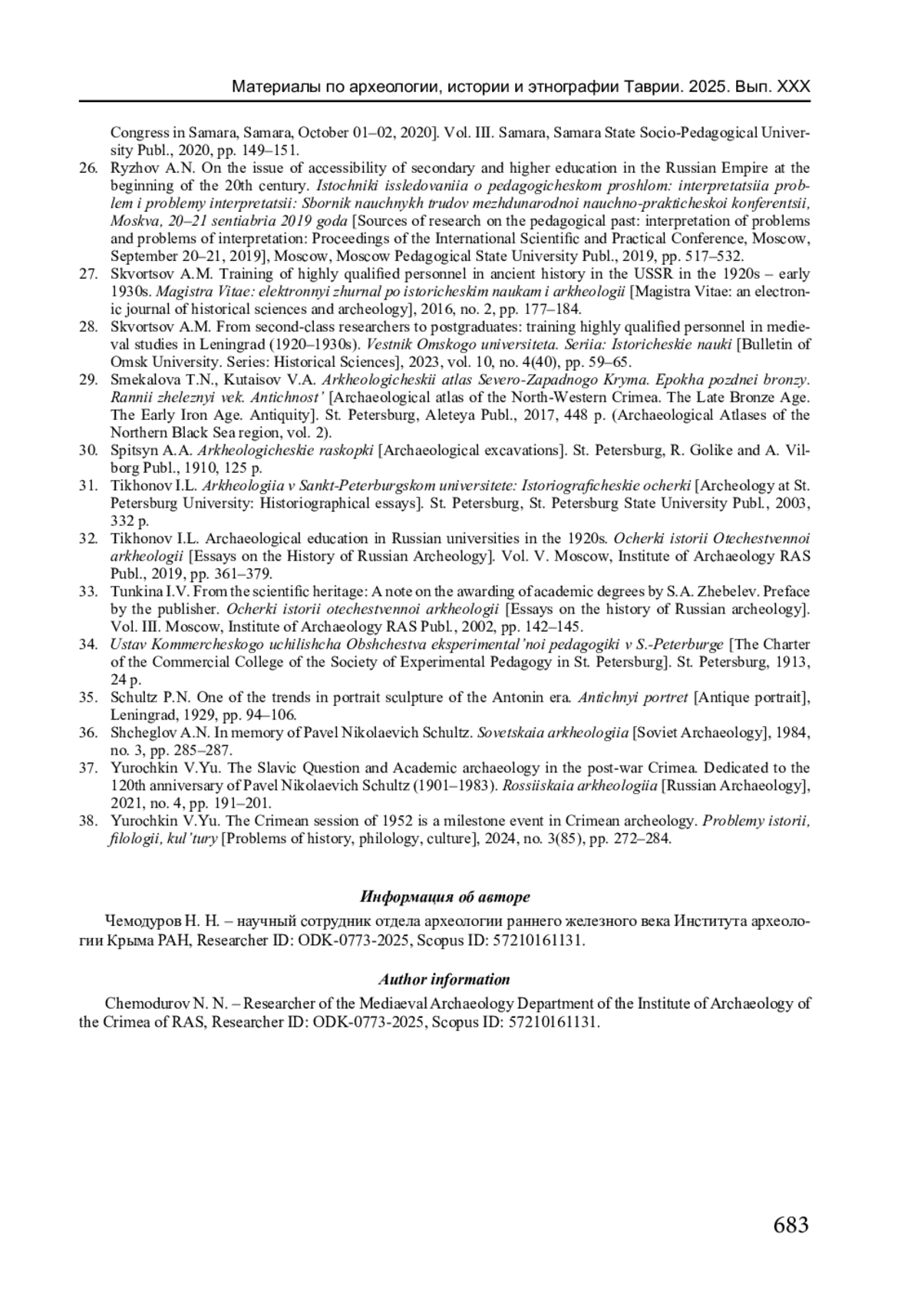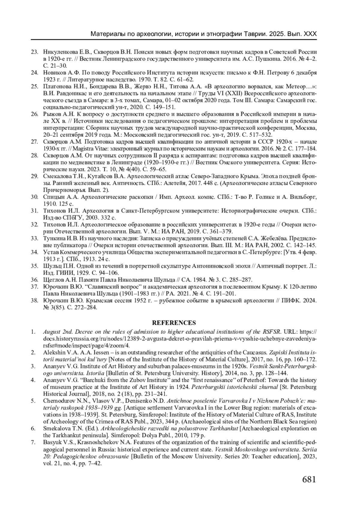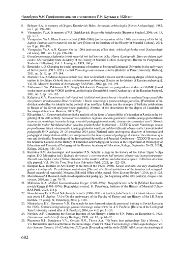 32. Тихонов И.Л. Археологическое образование в российских университетах в 1920-е годы // Очерки истории Отечественной археологии. Вып. V. М.: ИА РАН, 2019. С. 361-379. EDN: NAHGLG