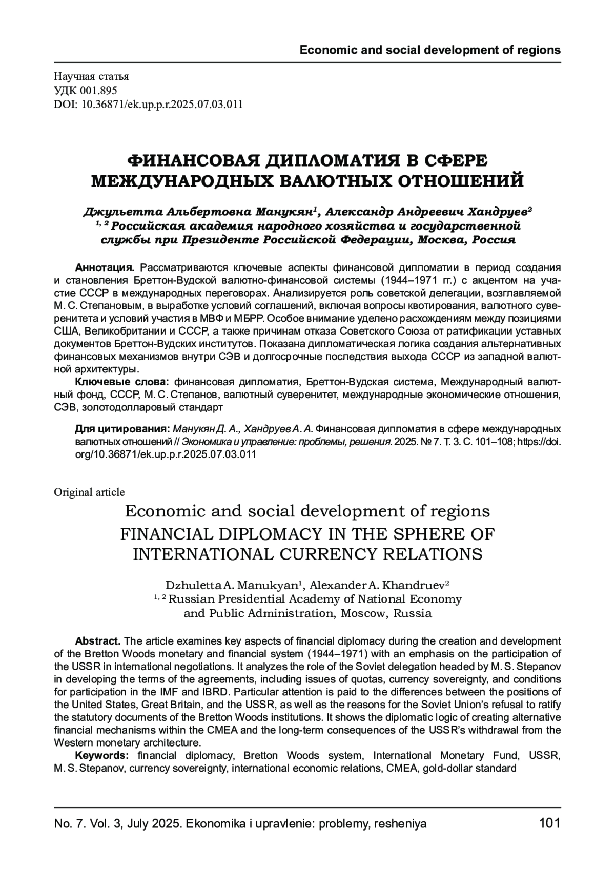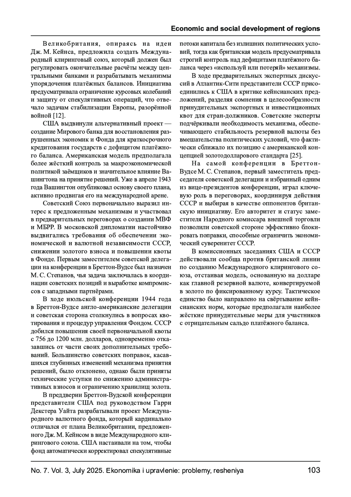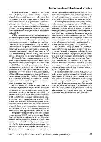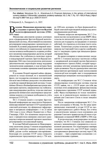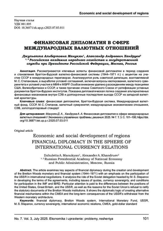 Рассматриваются ключевые аспекты финансовой дипломатии в период создания и становления Бреттон - Вудской валютно - финансовой системы (1944 -1971 гг.) с акцентом на участие СССР в международных переговорах. Анализируется роль советской делегации, возглавляемой М. С. Степановым, в выработке условий соглашений, включая вопросы квотирования, валютного суверенитета и условий участия в МВФ и МБРР. Особое внимание уделено расхождениям между позициями США, Великобритании и СССР, а также причинам отказа Советского Союза от ратификации уставных документов Бреттон - Вудских институтов. Показана дипломатическая логика создания альтернативных финансовых механизмов внутри СЭВ и долгосрочные последствия выхода СССР из западной валютной архитектуры.