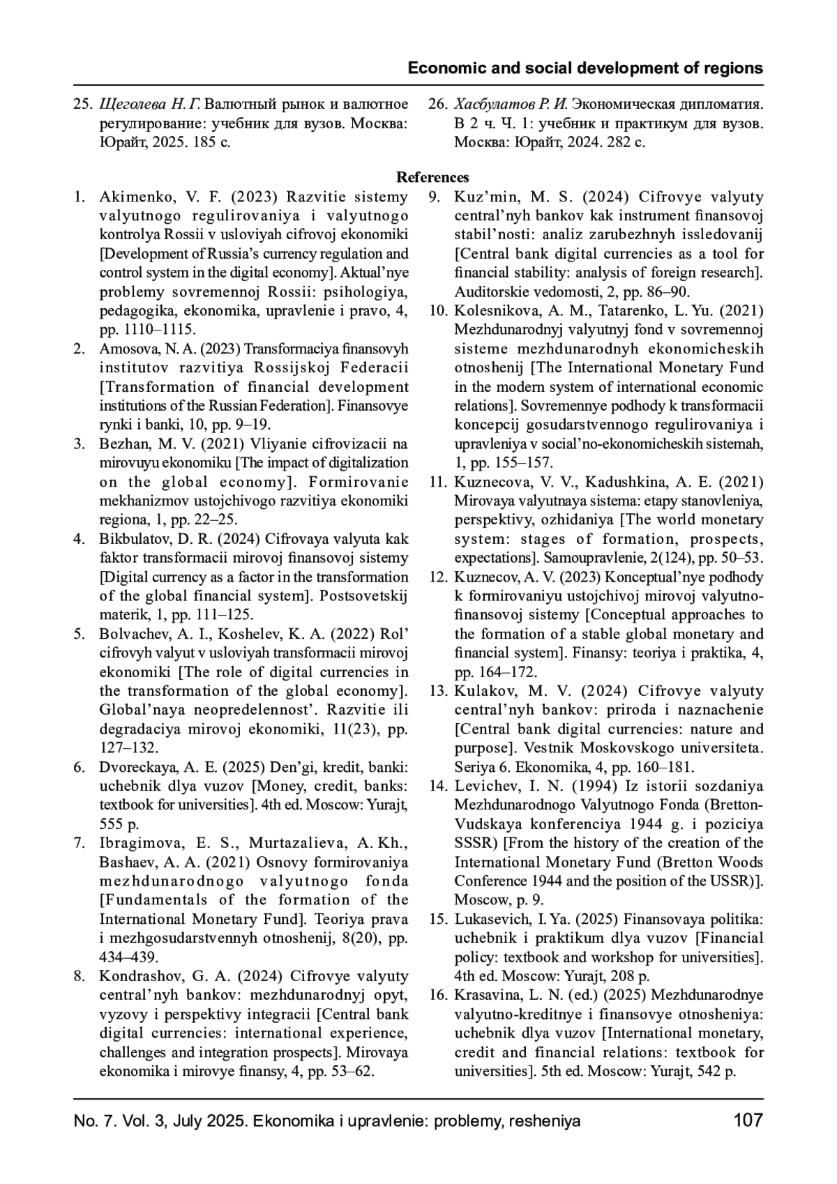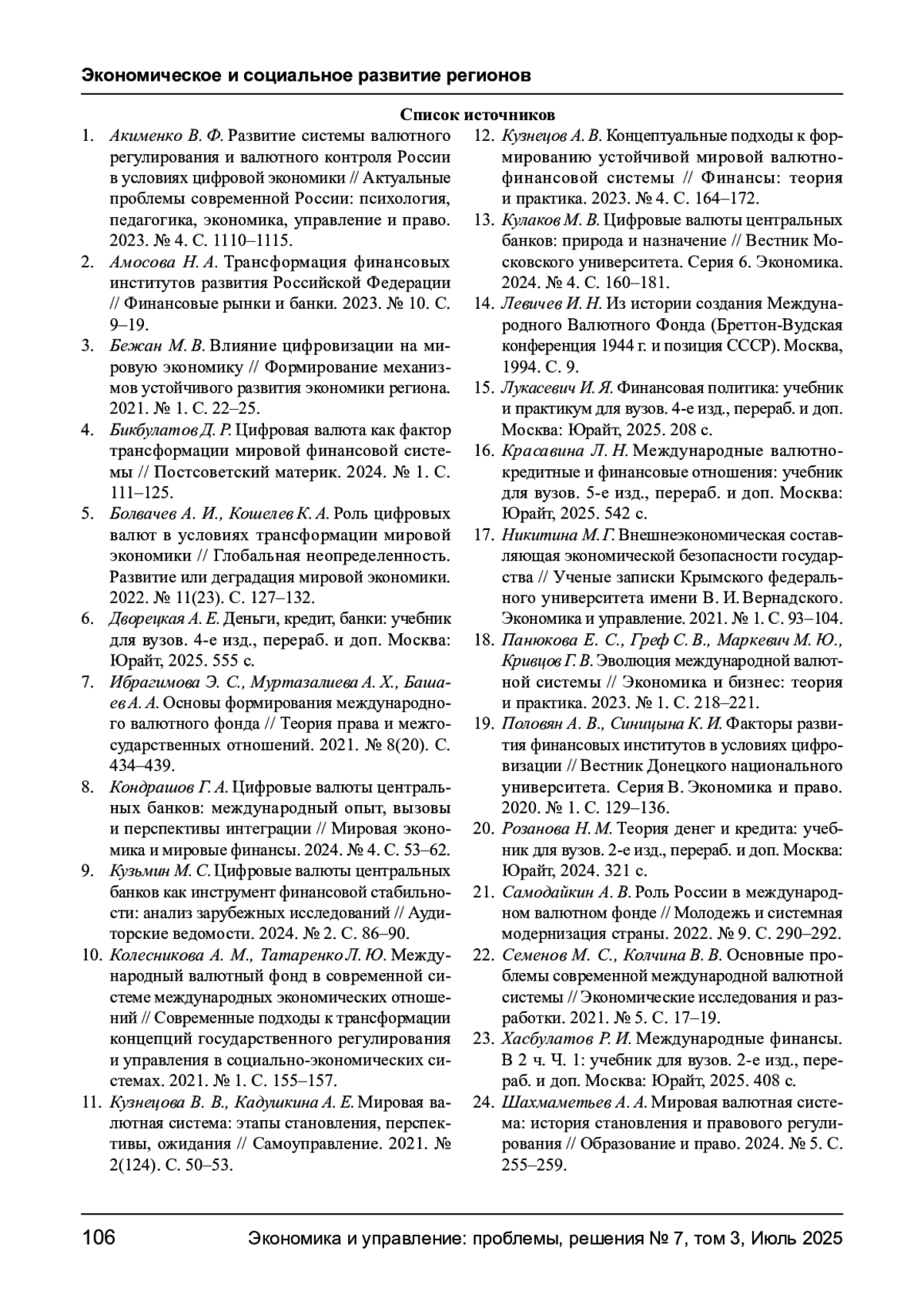 1. Акименко В. Ф. Развитие системы валютного регулирования и валютного контроля России в условиях цифровой экономики // Актуальные проблемы современной России: психология, педагогика, экономика, управление и право. 2023. № 4. С. 1110-1115. EDN: ZIXQIV